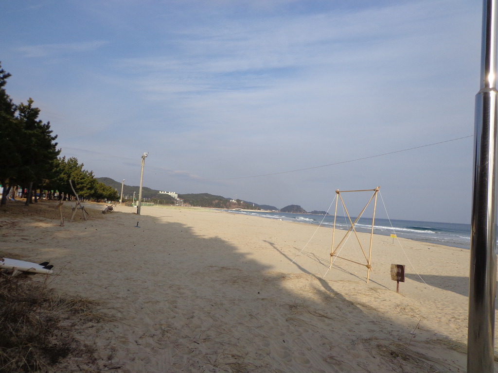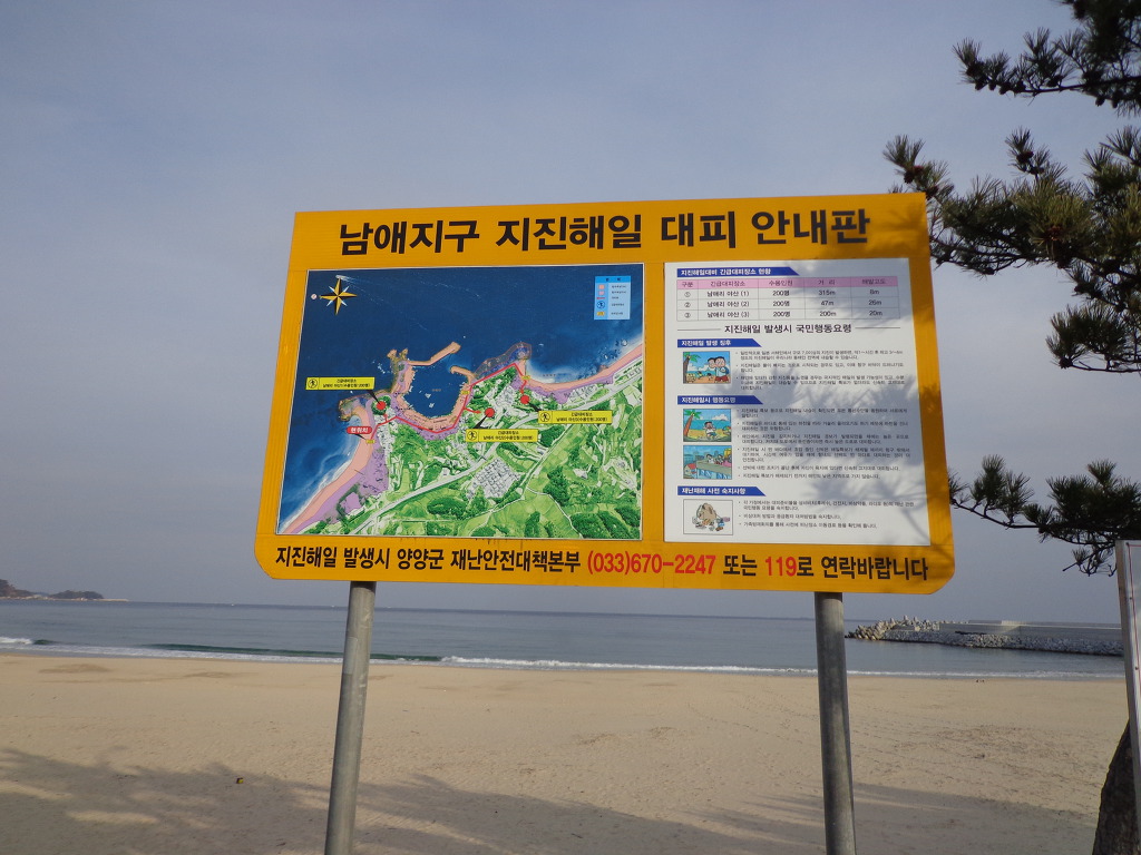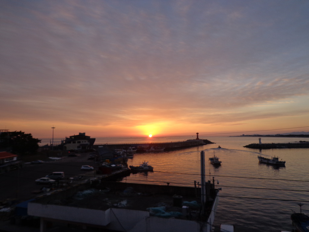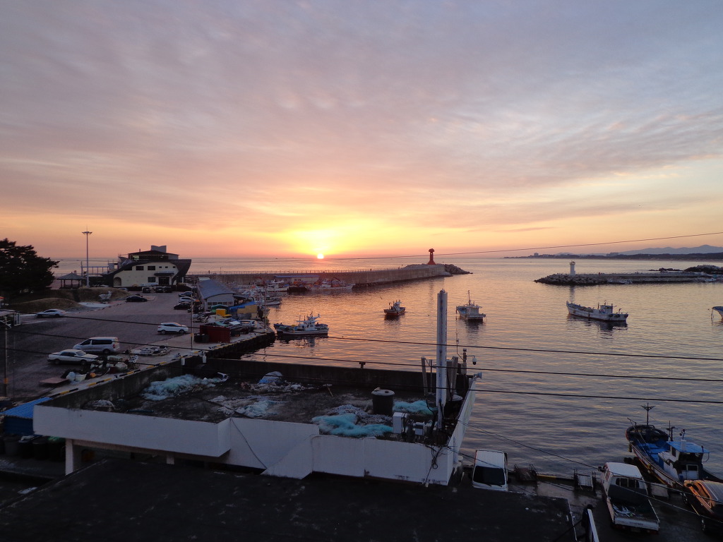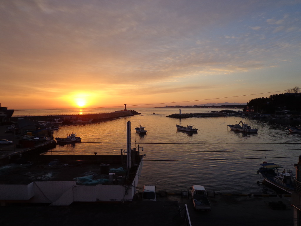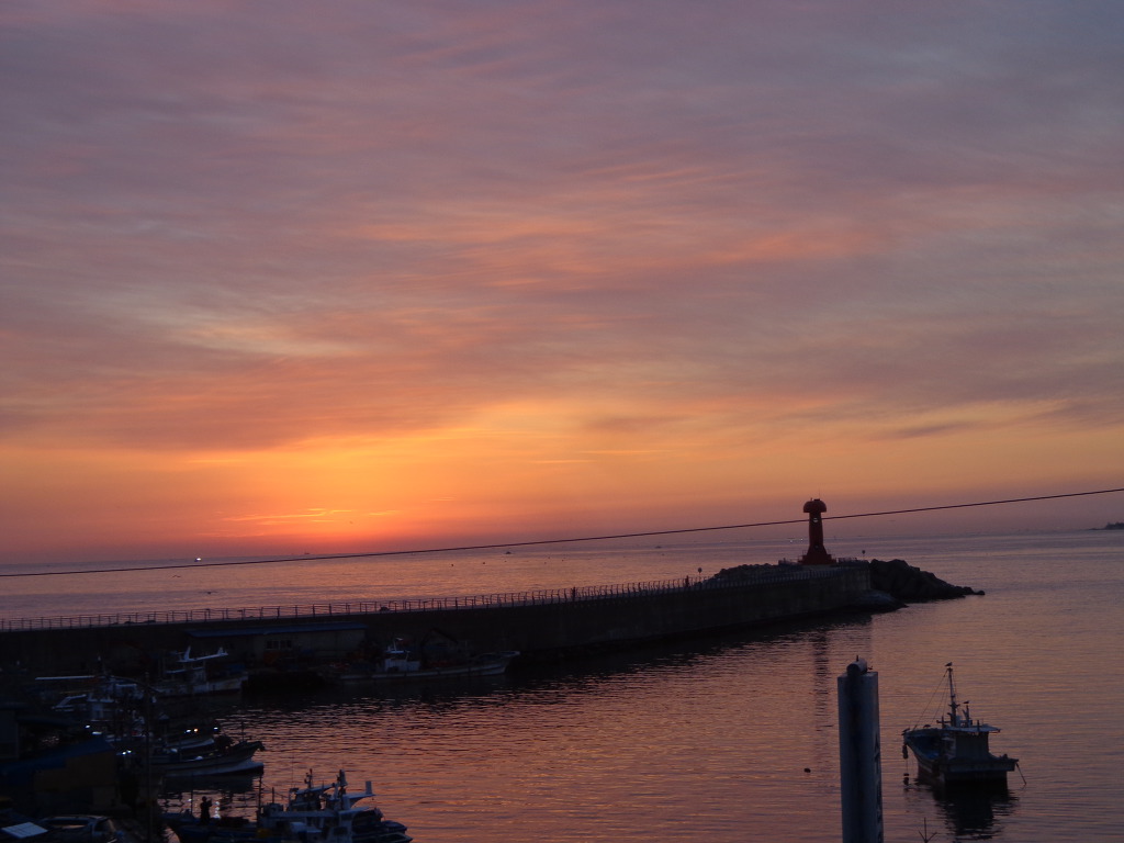 남애항에 오후 5시가지나 도착하여 먼저 식당에 가서 2만원짜리 생선구이 백반으로 저녁식사를 했다. 남애항은 너무도 조용했다. 유명하지 않은 곳임이 실감이 되었다. 거리에 사람도 없고, 문을 열고 있는 식당에도 손님은 우리뿐이었다. 식당 주인과 많은 대화를 하며 그 곳의 사정을 많이 알 수 있었다. 여름에 사람들이 많이 찾아온다고 했고, 1월 1일에도 사람이 많이 왔지만, 평소에는 거의 오는 사람이 없다고 했다. 숙소도 민박이 몇 군데 있고, 모텔이 해변에 한 곳이 있어서 찾아가니 역시 손님은 우리뿐이었다. 젊은 남자 혼자서 모텔과 식당을 지키고 있었다. 4만원을 주고 숙박을 했고, 다음날 아침은 둘이서 15,000원을 주고 황태해장국을 먹었다. 바닷가 방에서 숙박을 했기에 아침 해돋이는 밖에 나가지 않고 방에서 잘 보았다. 창문 정면에서 해가 솟았고, 날씨가 맑아서 바다에서 솟는 해를 똑바로 보았다. 해돋이를 보아온 중에 가장 잘 보게 된 새해 해돋이였다.