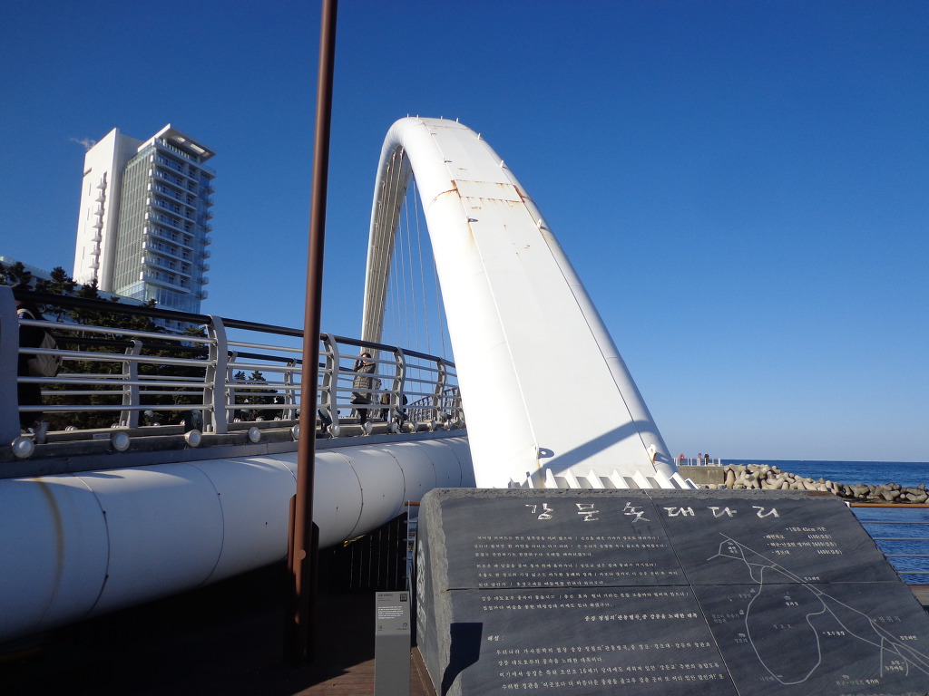 3일 목요일 아침 전철로 청량리역으로 가서 10시 22분 출발 KTX열차로 강릉으로 갔다. 경로활인 요금이 1인당 14,600원이었다. 12시 강릉역에 도착하여 역구내에 있는 식당에서 8,000원짜리 떡만두국으로 점심식사를 하고, 시내버스로 안목해변으로 나갔다. 강원도의 시내버스 요금은 1,260원으로 둘이 2,520원이었다. 안목해변은 카페거리가 유명해서 관광객이 많이 찾는 곳으로 알려진 곳이다. 카페거리에 즐비하게 주차되어 있는 자동차 행렬을 볼 수 있었다. 우리는 시원한 동해바다를 보면서 해변의 모래사장과 소나무 숲길을 따라 1시간 정도 걸어서 송정해변까지 갔다. 송정해변에서 택시를 타고 강문해변과 경포해변의 경계지점인 강문솟대다리에서 택시를 내렸다. 택시 기사가 친절하게 안내를 해주며 내리라고 했다. 2,800원의 요금을 주고 내렸다. 솟대다리에서 강문해변 방향의 경치는 바라만 보고 경포해변 방향 데크 길을 따라 걸었다. 경포해수욕장의 정문을 지나 경포호수 둘레 길로 갔다. 경포대까지는 너무 멀어서 둘레길만 조금 걸었고, 다시 시내버스로 오죽헌으로 갔다.