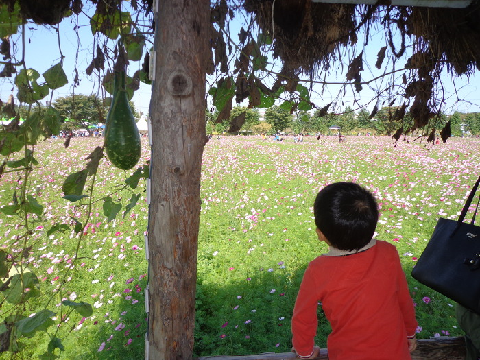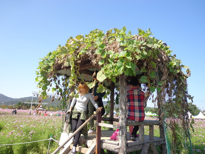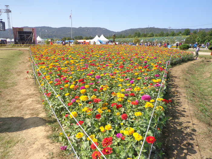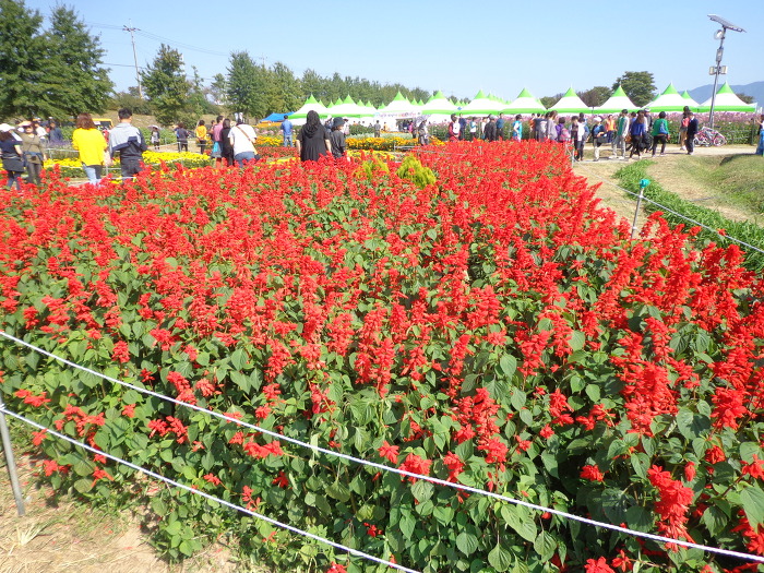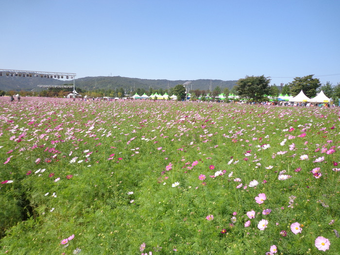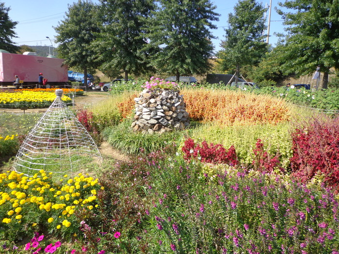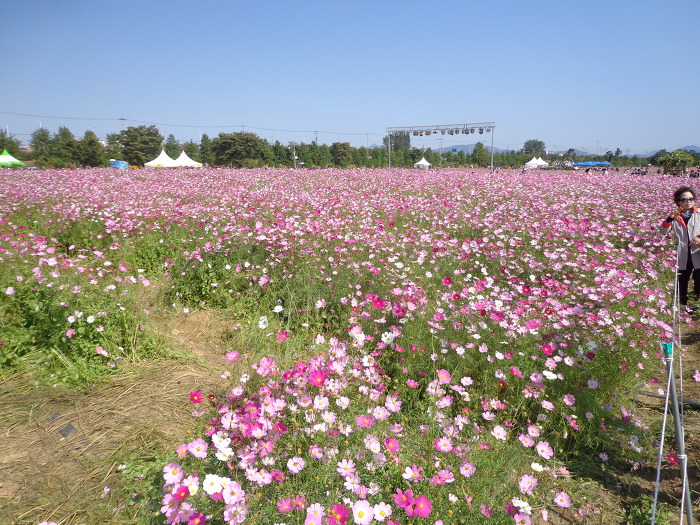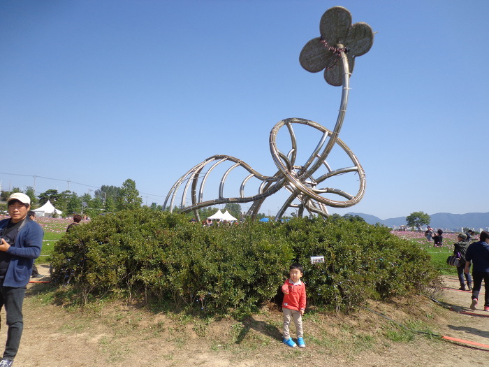 강변의 넓은 꽃밭 못지않게 상가가 넓게 형성되어 먹거리를 비롯한 여러 장사들이 넘쳐나는 것도 특이했다. 버스에서 내려 상가를 통과해서 꽃밭을 찾아가야 했다. 코스모스외에도 국화를 비롯한 각종 꽃들과 농작물들이 많아서 손자를 데리고 다니면서 이야기거리가 많아서 좋았다. 10월초의 연휴에 즐거움을 만끽한 삶이었다.