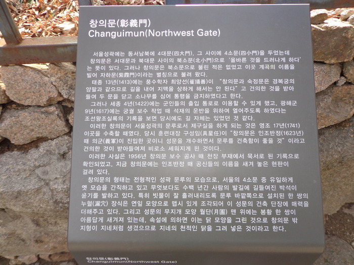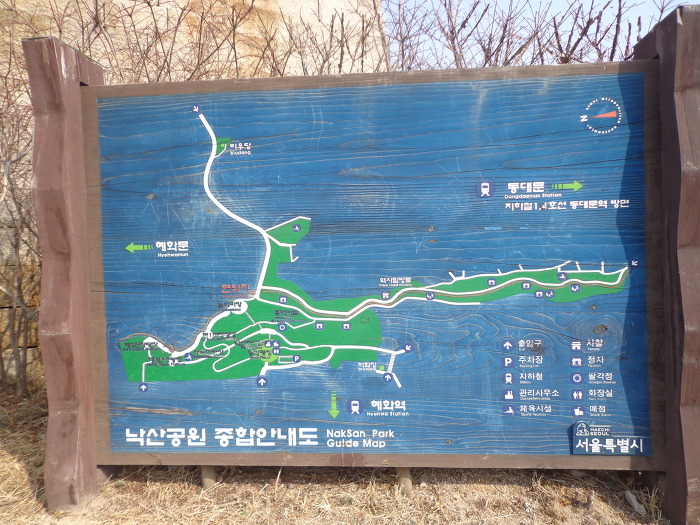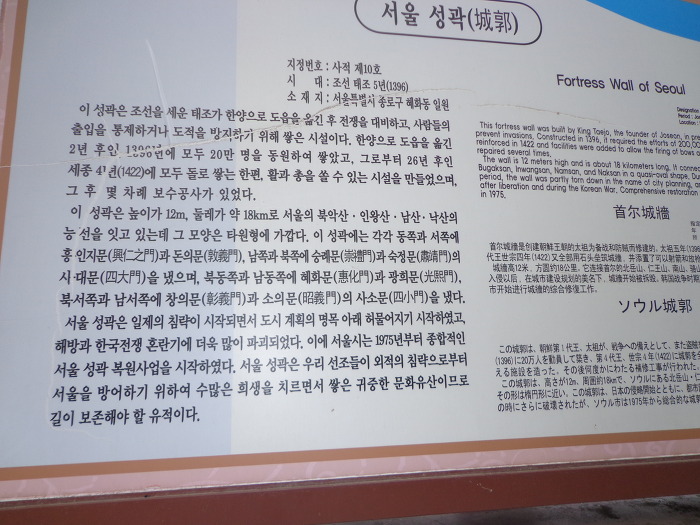 오늘의 코스는 동대문역 7번 출구로 나가서 출구 바로앞의 흥인지문(동대문)에서 우측으로 보이는 성곽을 보고 동대문 성곽공원으로 올라갔다. 성곽을 따라 낙산공원 - 혜화문 - 와룡공원 - 북악산 지역 성곽을 따라 말바위 안내소 - 숙정문 - 창의문까지 성곽길을 걸은 후 청와대 사랑채를 지나 3호선 경복궁역으로 가서 오늘의 걷기를 마감했다. 성곽길은 인왕산 지역으로 계속 가야 하는데 안내 표시도 없어 헤매다가 시간도 많이 지나고 피곤하여 성곽길은 다음에 계속 이어서 걷기로 하고 경복궁역으로 가서 귀가 길에 오른 것이다. 대체로 성곽 안내표시가 거의 없어서 성곽이 있는 곳은 가기가 쉬웠으나 성곽이 끊기는 곳에서의 길 찾기는 아주 좋지 않았다.