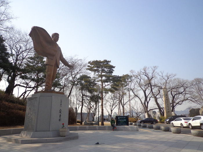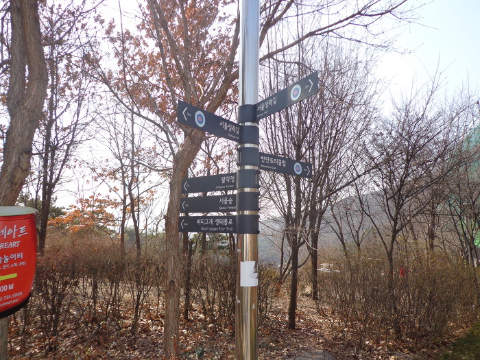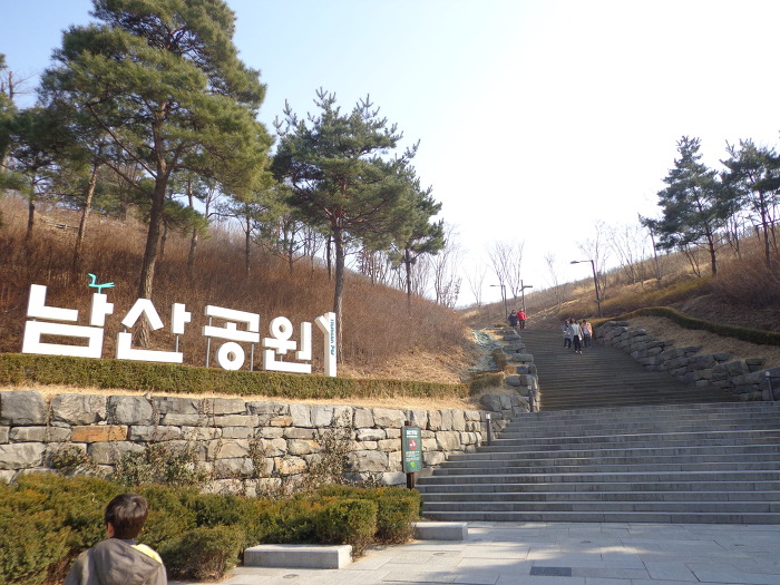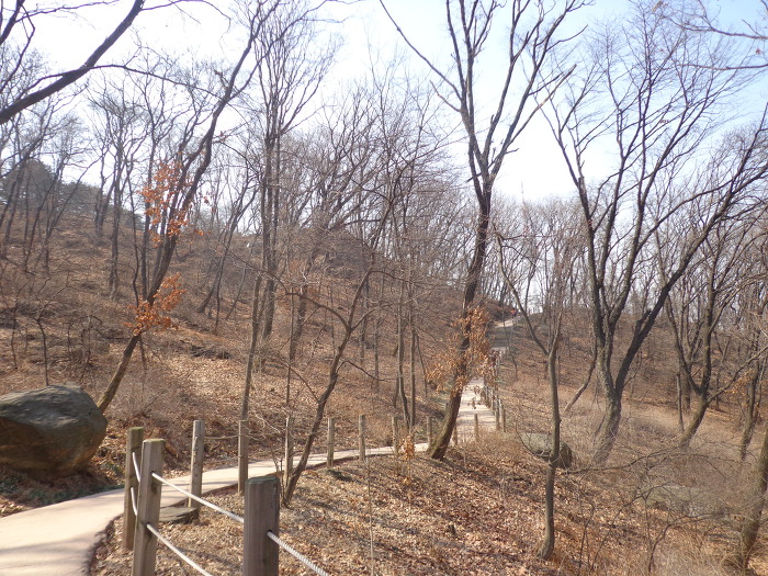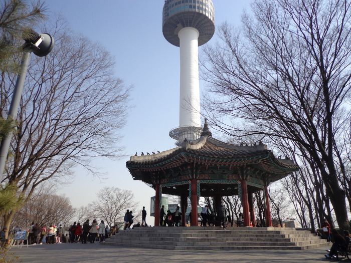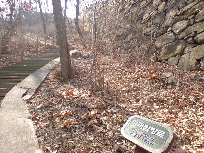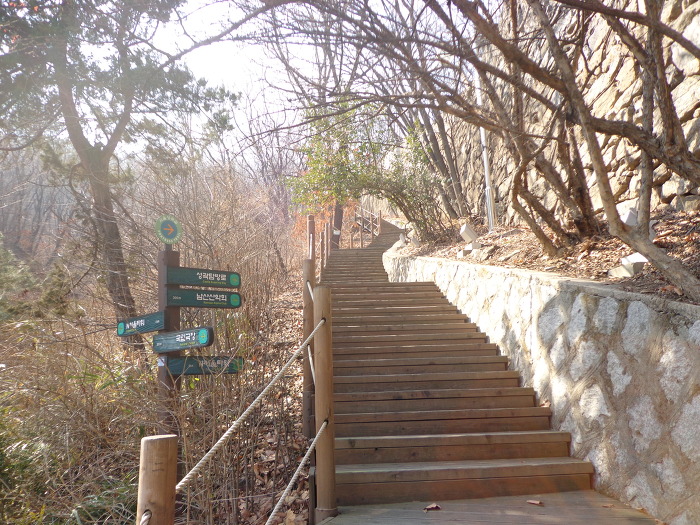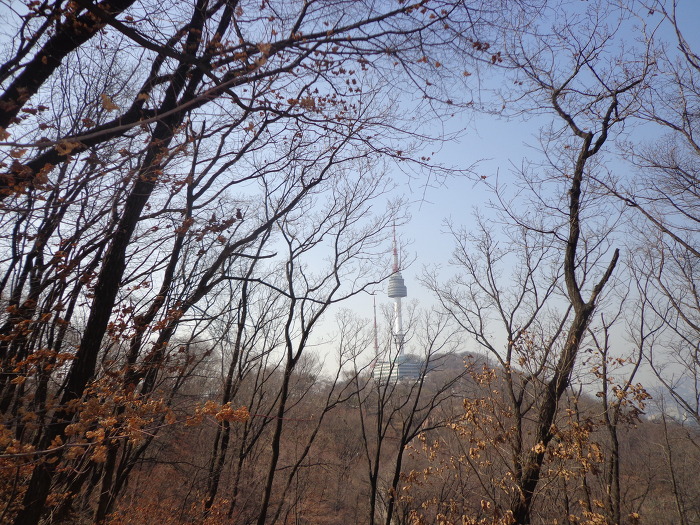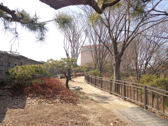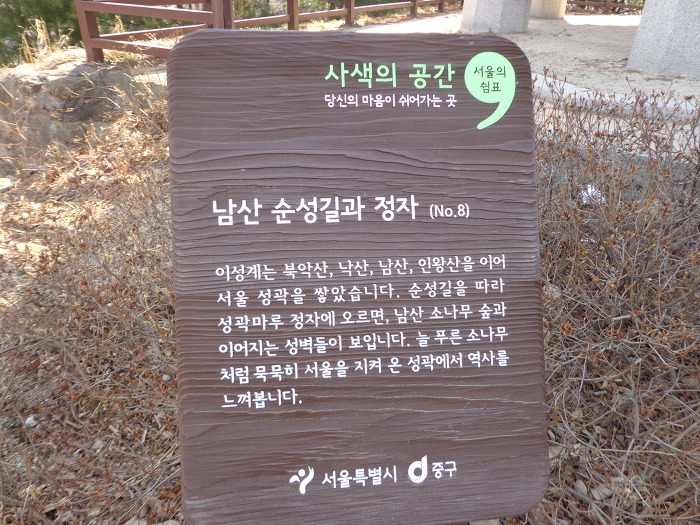 성곽마루 팔각정이 있는 곳의 안내표시가 엉터리로 방향을 가리키고 있어서 30여분 헤매다가 다시 팔각정이 있는 곳으로 가서 반야트리 클럽 표시가 있는 방향으로 찾아 갔다. 반야트리호텔 경내를 지나 국립극장으로 해서 남산 성곽길을 찾아 올라 갔다. 250m로 표시된 성곽길은 계속 계단을 오르는 상당히 경사가 급한 길이었다. 남산타워 앞의 광장에는 사람이 많았다. 여기저기서 중국말이 많이 들렸다. 성곽을 따라 하산하여 숭례문에 이르러서 오늘의 걷기를 마감했다. 날씨는 좋았지만 감기기가 있어 몸이 좀 무거웠다.