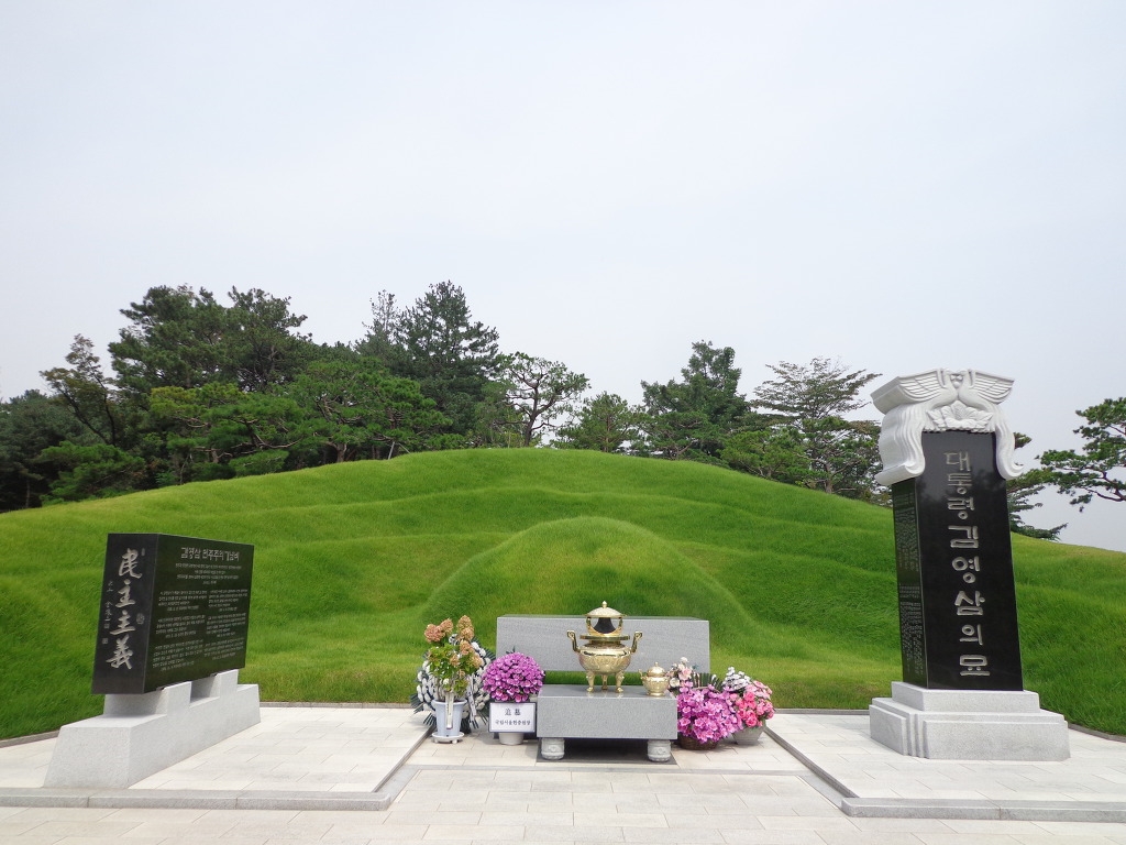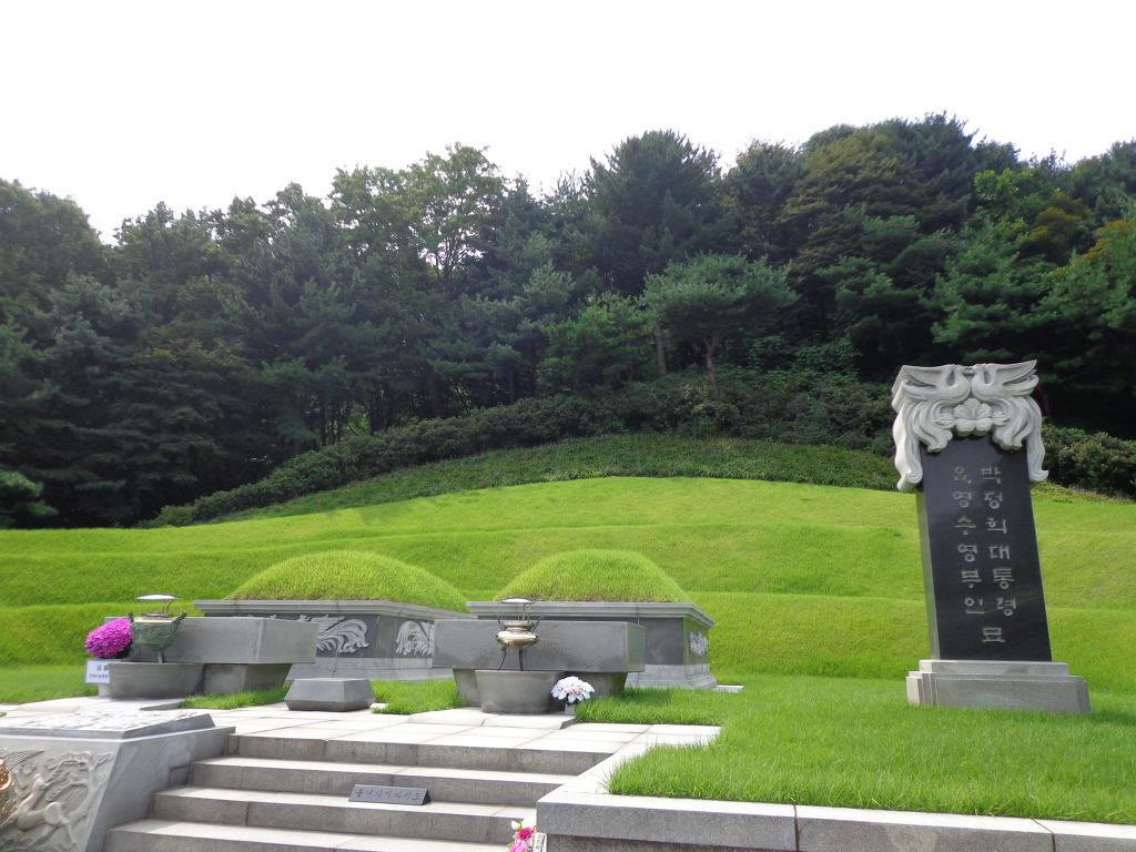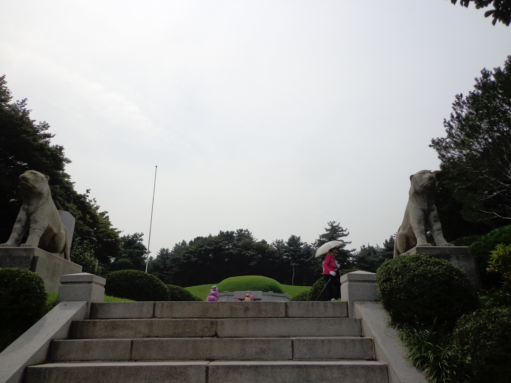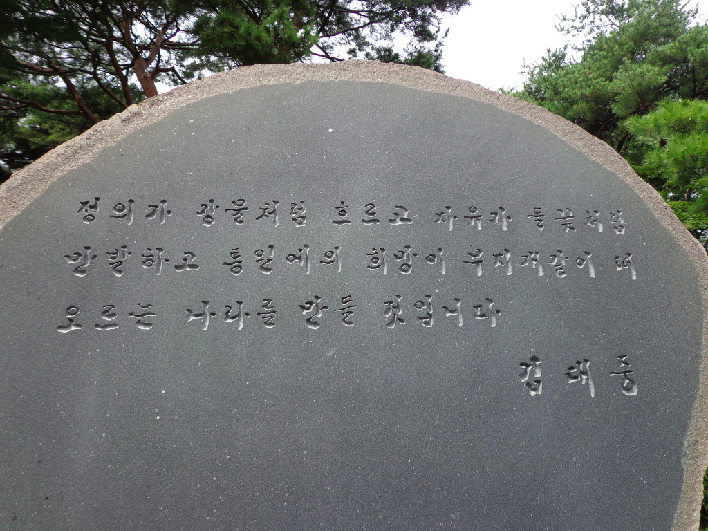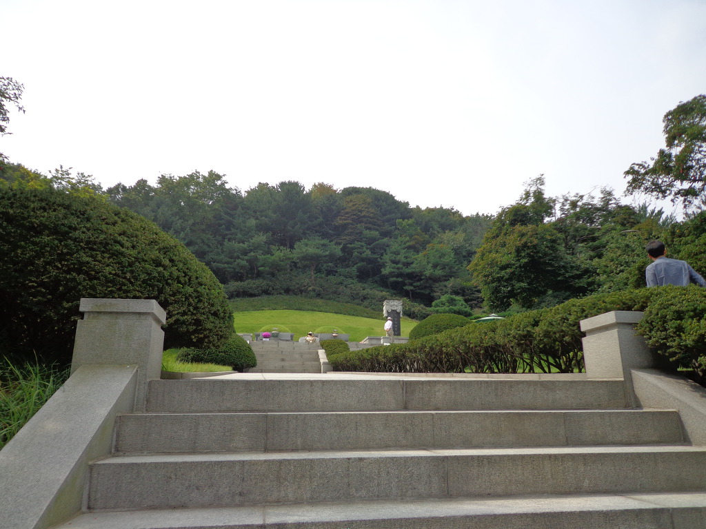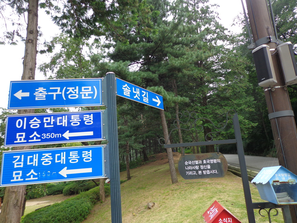 오늘의 코스는 지하철 4호선 동작역에 내려서 8번 출구로 나가 현충원 정문에서 부터 1, 2, 3, 4, 5묘역 옆길로 해서 애국지사묘역과 충열대를 지나 비교적 최근에 안장된 김영삼대통령묘에 갔다. 높은 곳에 넓은 면적을 찾이한 묘로 조성되어 있었다. 다음에 박정희대통령부부의 묘를 보고 김대중대통령의 묘에 갔다. 대통령의 묘 가운데 김대중대통령의 묘가 가장 좁은 면적이고 다른 곳에 비해 주차장 시설도 없어서 마음이 서운 했다. 김대중을 대통령 되게 하기 위해서 부지런히 투표했던 생각이 나서 묘 앞에서 사진을 찍었다.