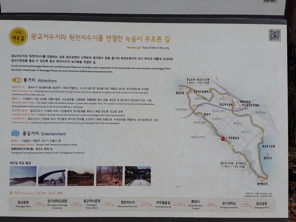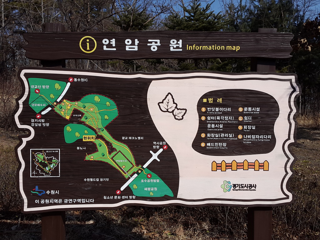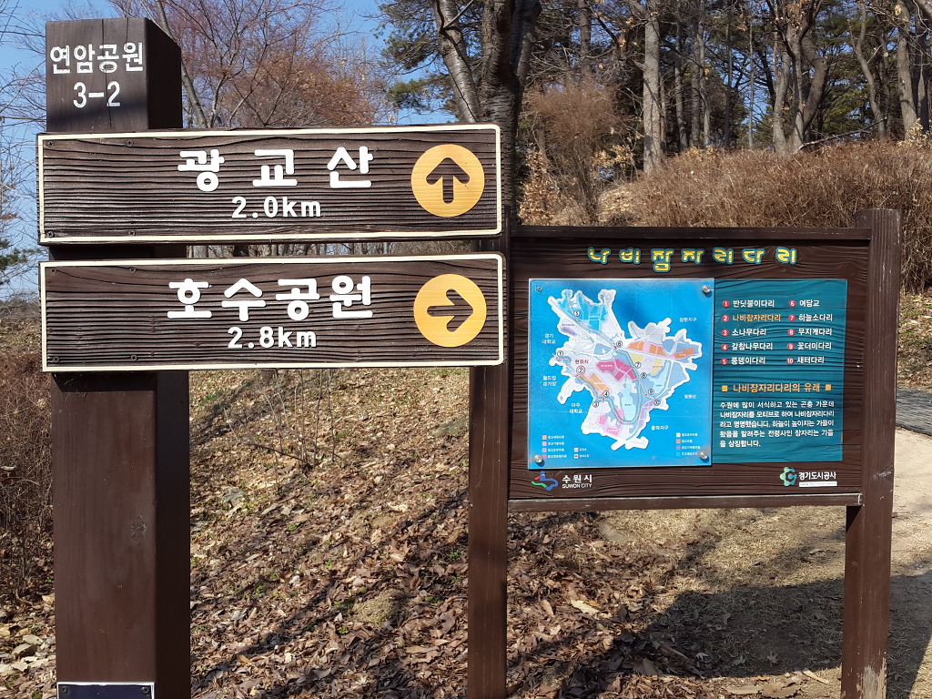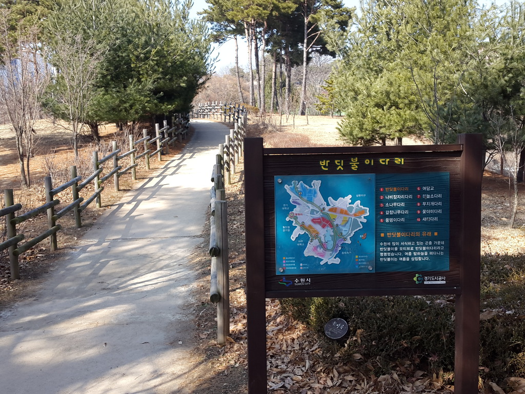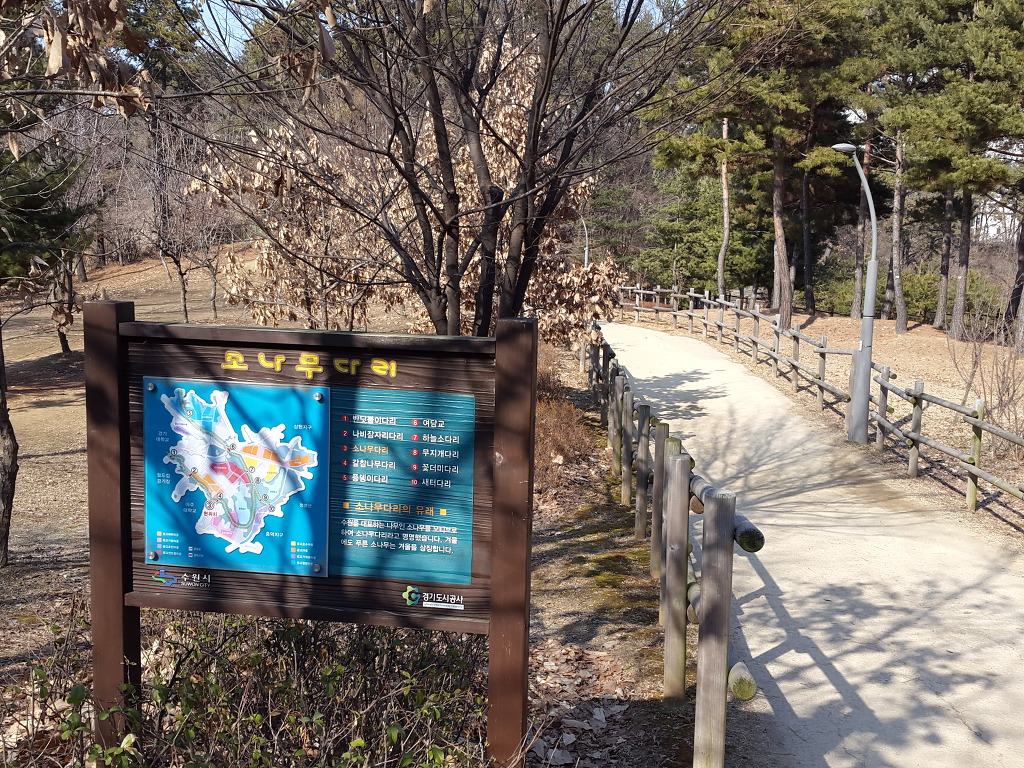 코로나 바이러스로 복잡해서 지하철을 이용하지 않고 집에서부터 도보로 다닐 수 있는 길을 택하여 오늘은 수원의 여우길을 걸었다. 집에서 출발하여 도란길의 일부를 걸어 원천교까지 가서 원천리천변 산책로로 광교호수공원의 원천호수로 갔다. 원천호수에서부터 여우길이 시작되어 여우골 숲길을 따라 아주대갈림길-월드컵경기장갈림길-봉녕사갈림길-연암공원-수원박물관갈림길-수원박물관-경기대학교정문-중앙도서관-경기대후문-쇠죽골천변산책로-광교역사박물관-여천변산책로를 따라 다시 원천호수로 돌아오는 길을 걸었다.