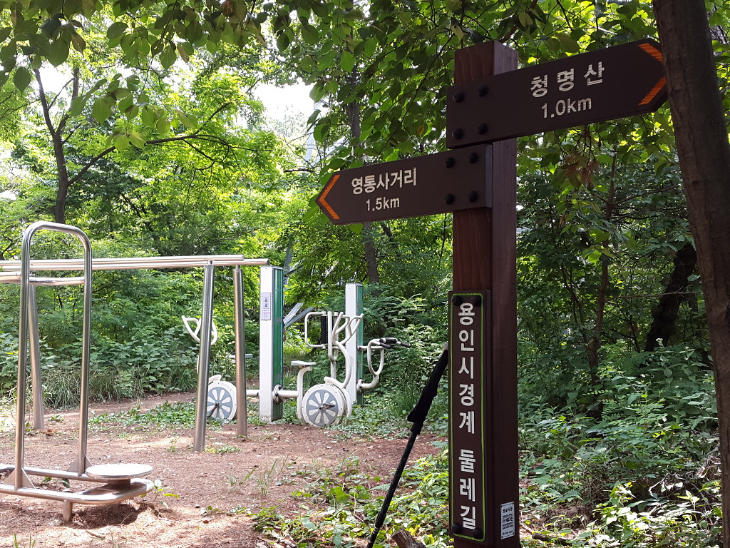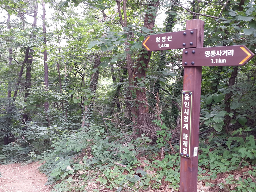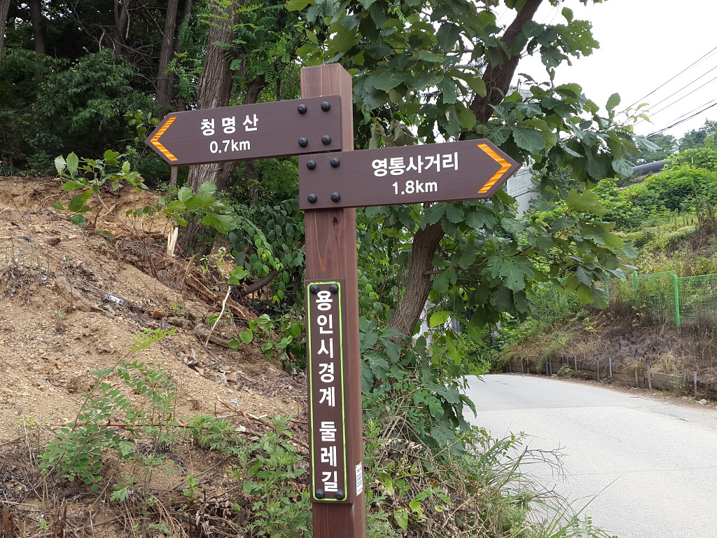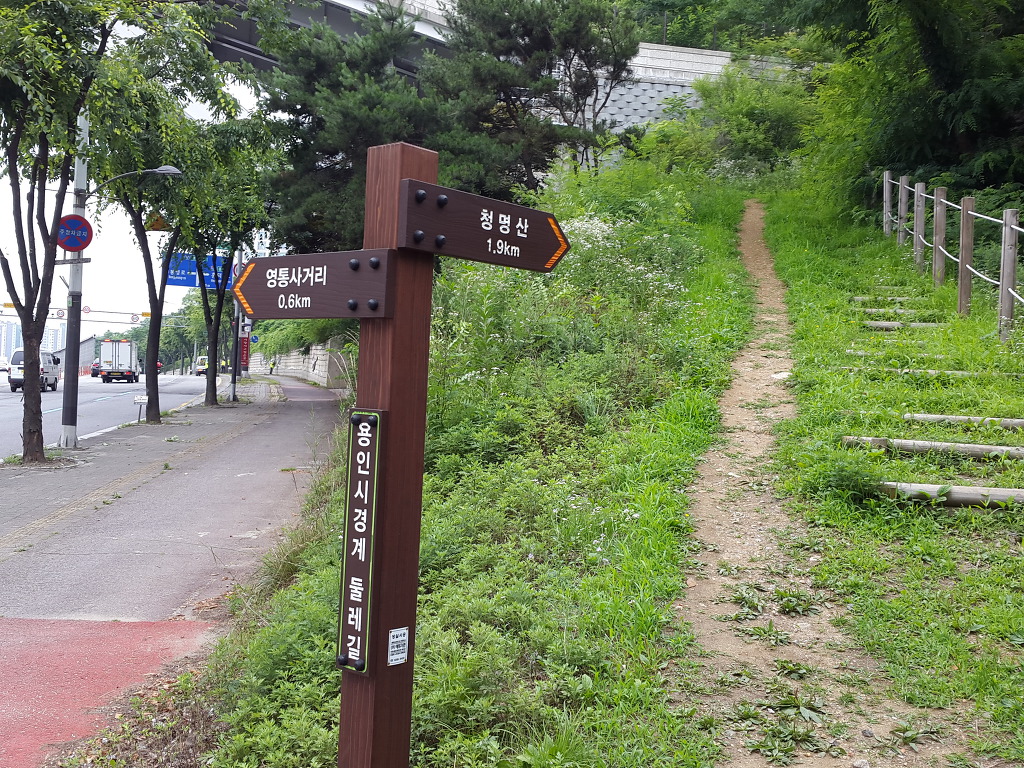 청명산 산책로를 걷다가 새롭게 용인시경계둘레길이라는 안내표시 기둥들이 보여서, 그 시발점으로 가서 사진을 찍으며 걸었다. 시발점은 청명산에서 매미산으로 건너가는 하나은행연수원이 있는 자동차길 도로변에서부터 시작했다. 집에서 오전 9시 30분경 출발하여 약 1시간을 걸어서 시발점으로 갔다. 이후 표지판을 보며 청명산 정상을 지나 청명마을 2단지아파트 가까이 삼거리에서 우측으로 가서 자동차도로 건너편 청명산으로 갔다. 산책로를 따라 걸어서 청명산과 자은공원의 경계가 되는 육교 건너에서, 우측 계단으로 자동차도로로 내려가서 큰길을 따라 영통사거리까지 이어지는 둘레길을 확인했다. 새로운 길이 아니고 그 동안 가끔 걸었던 길인데, 새로운 이름이 붙은 표시판을 보고 다시 걸어본 것이다.