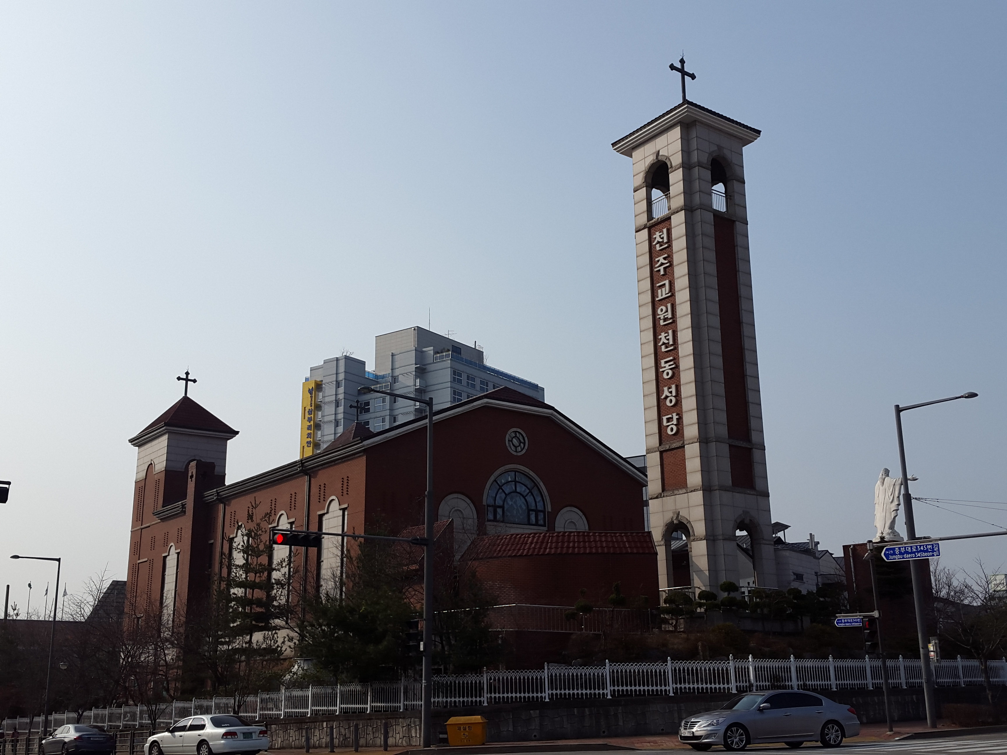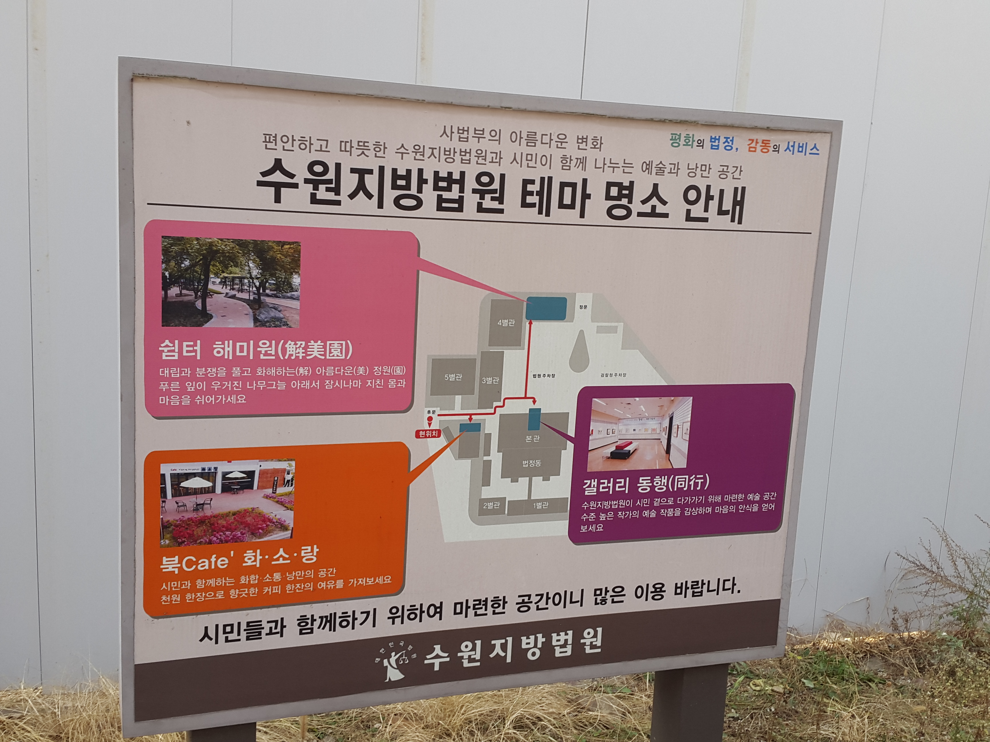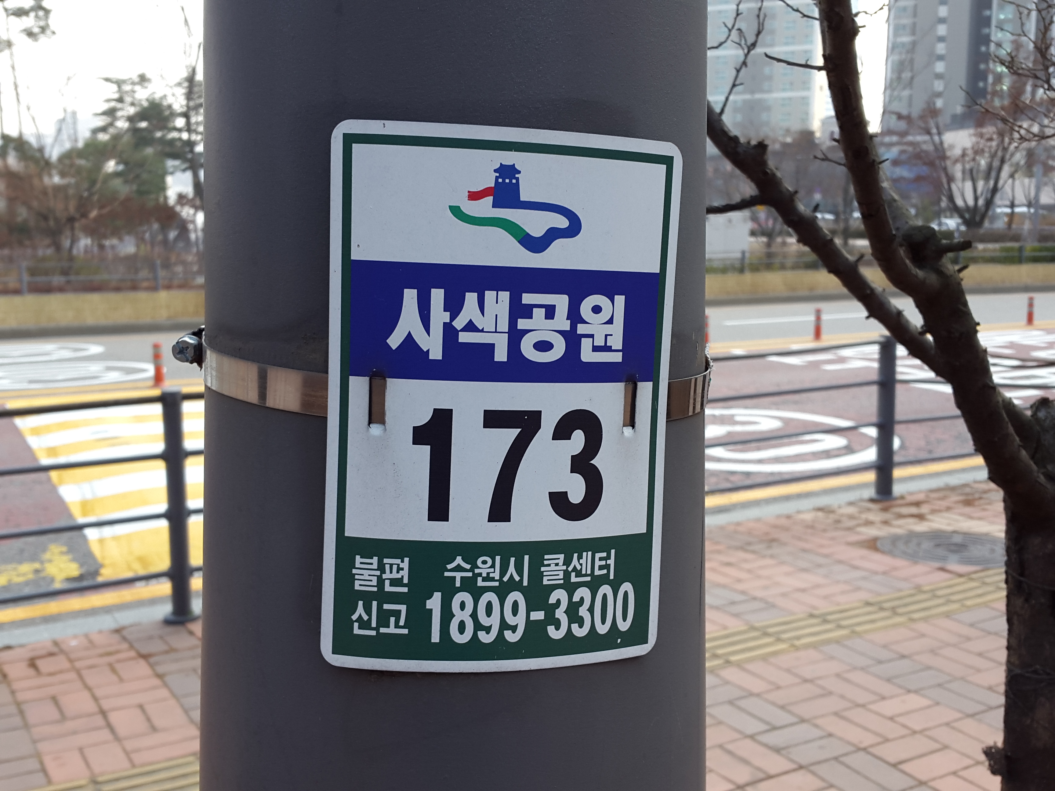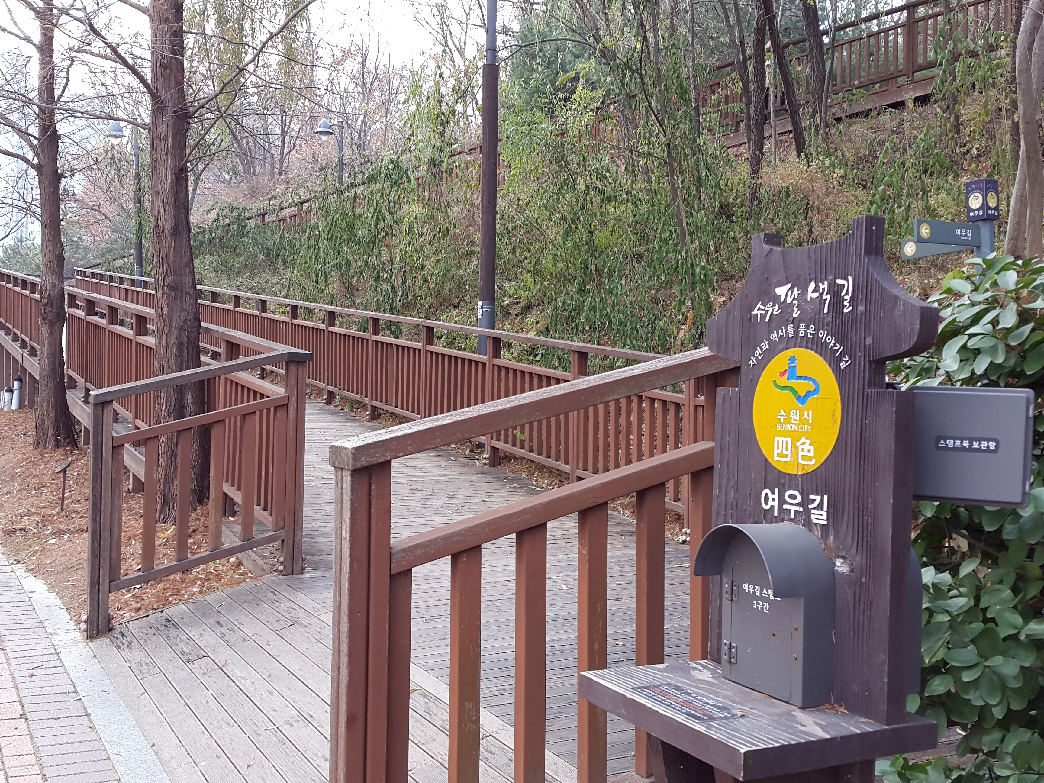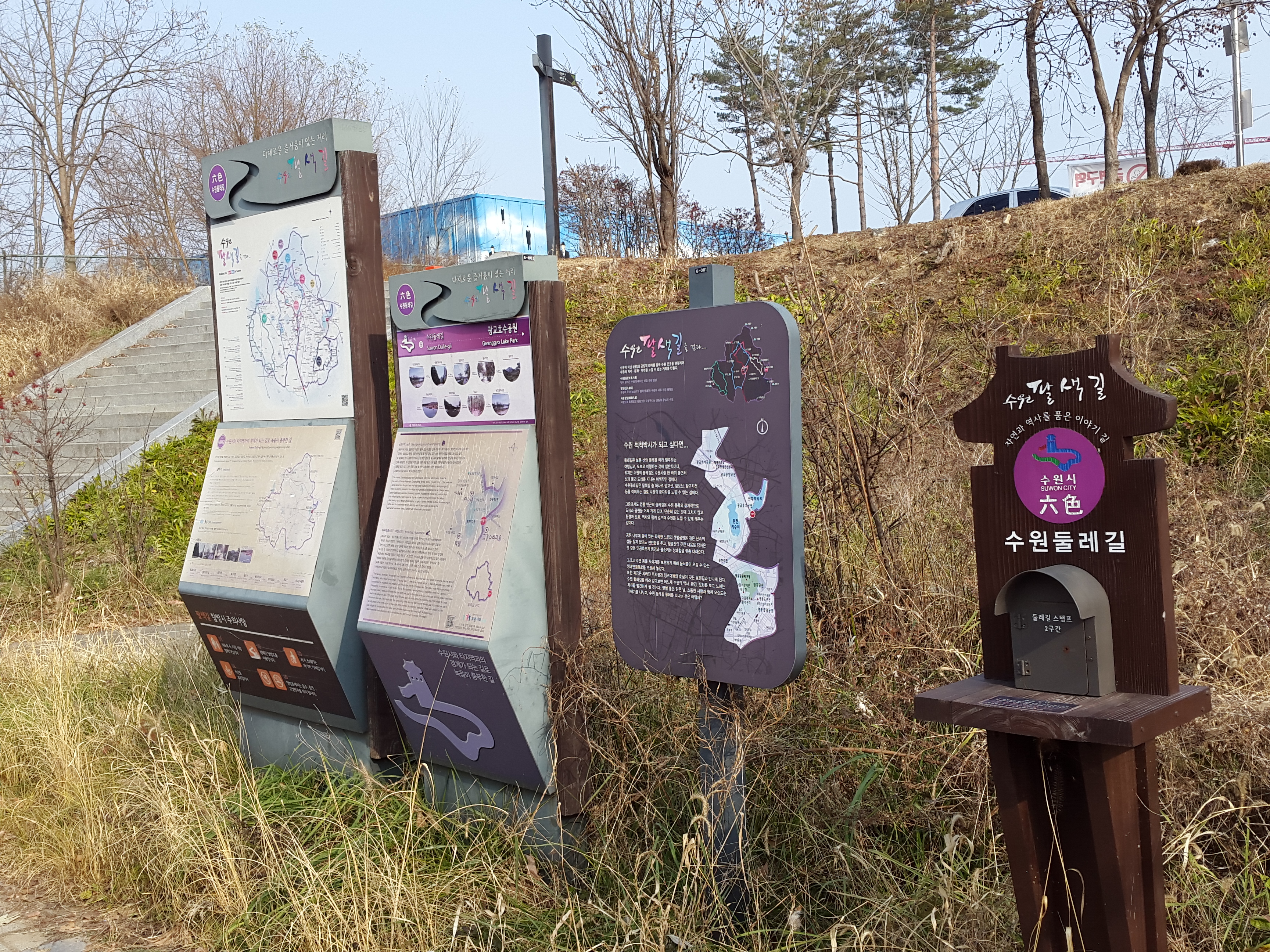 오늘의 코스는 먼저 시내 길로 원천리천까지 가서 원천리천 산책로로 광교호수공원의 원천호수로 갔다. 원천호수에서 이어지는 수원 8색길중 여우길을 따라 가다가 사색공원 갈림길에서 가본 적이 없는 사색공원 길을 안내기둥을 따라서 갔다. 계속 하산 길이었고 천주교원천동성당이 있는 큰길과 만났다. 사색공원 안내기둥이 큰길을 따라 계속 있었고, 다시 원천호수에서 여우길로 이어지는 지점으로 회기한 것이 되어, 원천호수에서 귀가 길을 선택해야 했다.