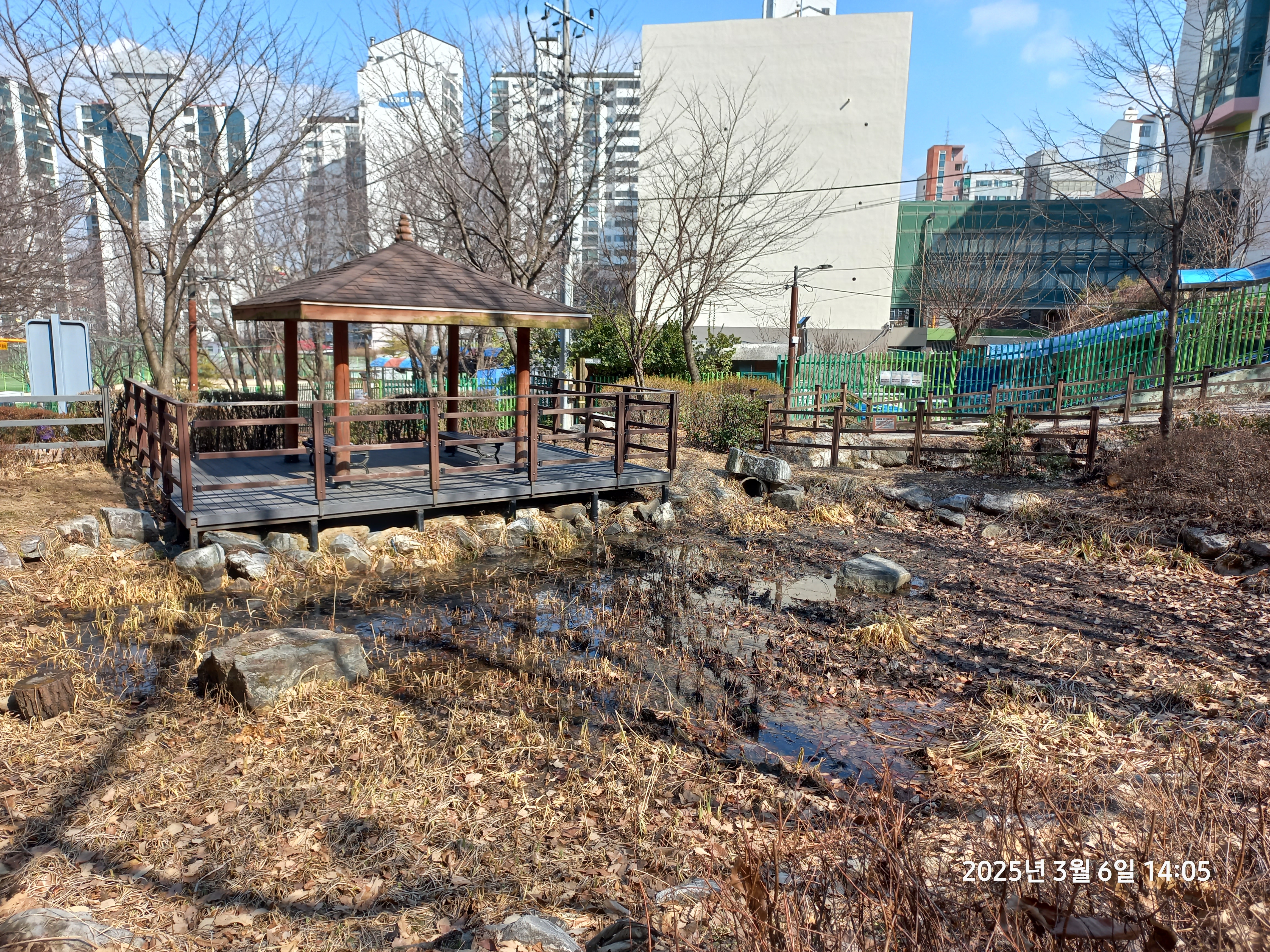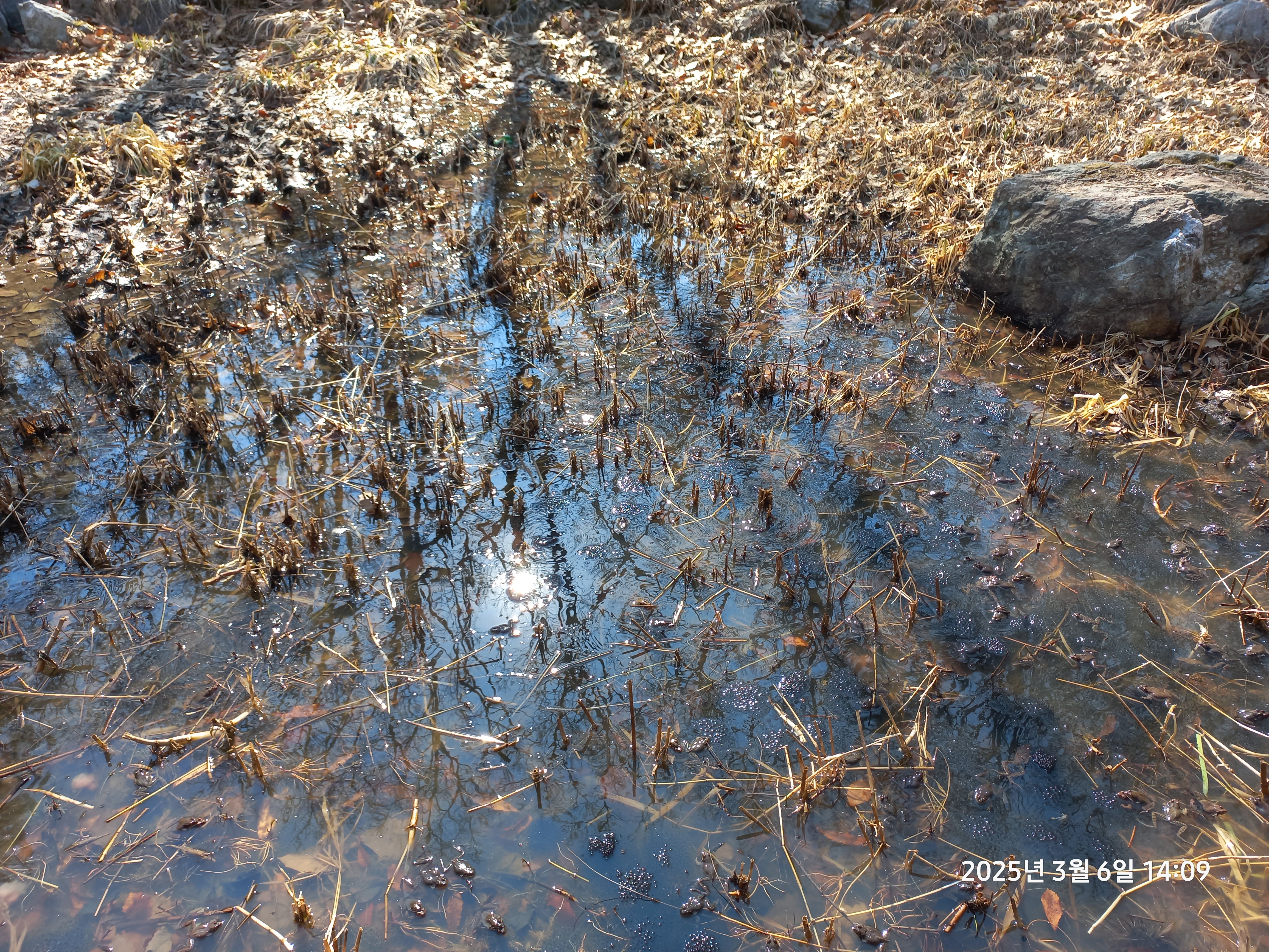 동네뒷산공원이라는 안내표시를 보고 청룡산약수터 방향으로 하산했다. 청룡산약수터는 물을 마실 수 있는 적합 판정의 표시가 있고 약수를 받아 가는 사람도 있어서 약수를 한컵 마실 수 있었다. 약수터 옆에 어린이들을 위한 모험 놀이터 등 여러 가지 시설이 다양한 유아숲체험장이 있어 돌아보고, 청룡산체육관을 지나 생태연못으로 갔다. 연못에는 수많은 개구리들이 요란한 소리를 내며 떠들썩 해서 개구리들의 소리가 녹음되는 동영상을 찍었다. 아직 눈이 다 녹지 않은 곳도 있었으나, 연못에서의 개구리들이 분명히 봄이 왔음을 합창으로 알려주고 있음을 확인했다. 생태연못에서 상당 시간 머물렀고, 다시 관악구청이 있는 곳으로 가서 지하철 서울대입구역에서 지하철로 귀가 길에 올랐다. 완연한 봄 날씨에 도보여행 하기에 아주 좋은 곳에서, 만난 사람들과 담소도 나누면서 하루를 즐겁게 보냈다.