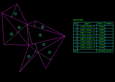 구적의 방식은 두가지가 있으며, 대지경계선 등을 만드는 삼각구적을 선택하고, 대지경계선을 선택하면, 아래와 같은 삼각구적표를 그립니다.