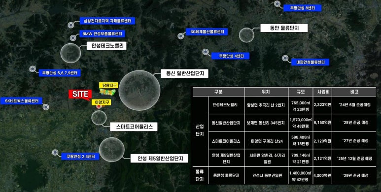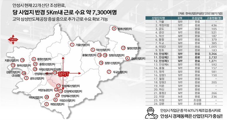 ▶ 사업장 인근에 다수의 산업단지 분포로 직주근접이 우수 하다. _ 동항일반산업단지, 안성테크노벨리(예정), 안성 제1산업단지, 안성 제4산업단지, 용인sk반도체 클러스터(예정), 삼성 반도체 공장(예정), 스마트코어폴리스(예정), 안성제2,3 산업단지 등.