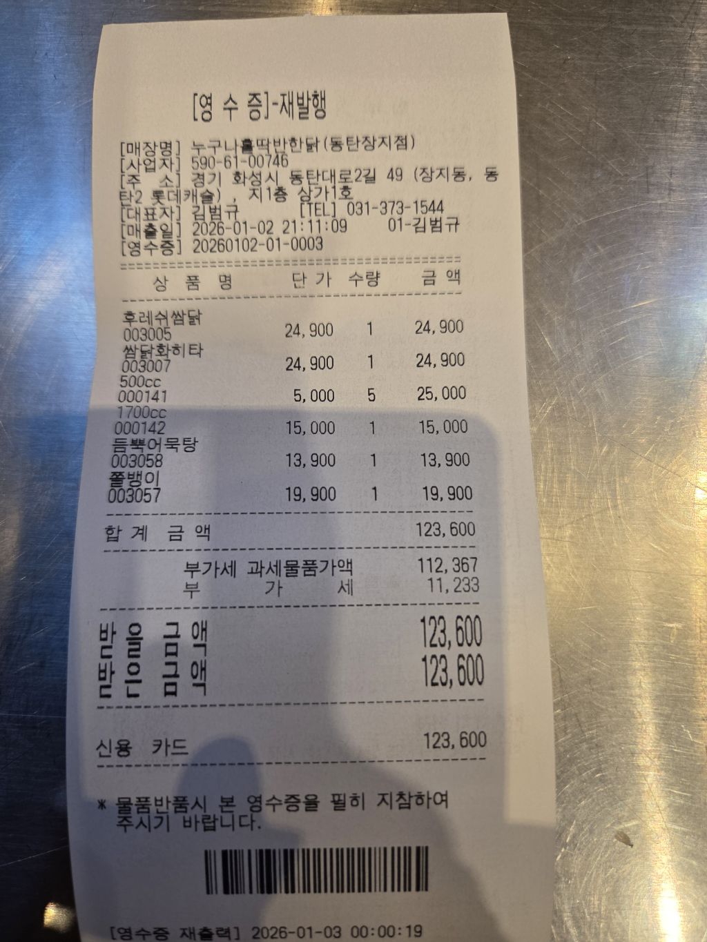 | [지출 내역 기재] 1차(장소 : 치킨집 ) - 123,600원 2차(장소 : 노래방 ) - 59,000원 (게스트님 찬조5만원) = 지출 합계 :182,600 원 | |