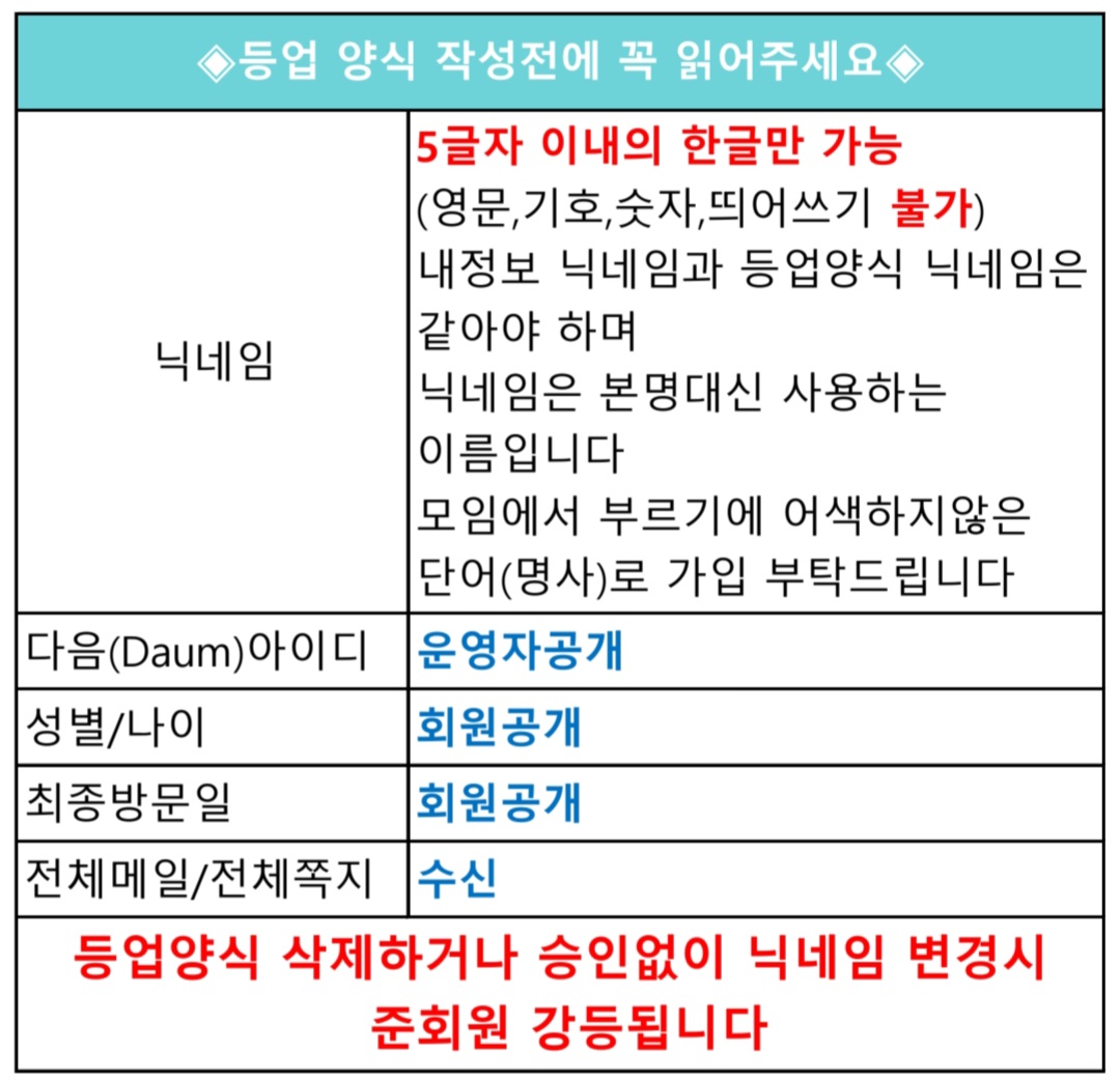 | ※ 등업 이후or 카페 활동중 가입 신청양식을 삭제하는 행위는 강등 또는 활동중지 됩니다. | |