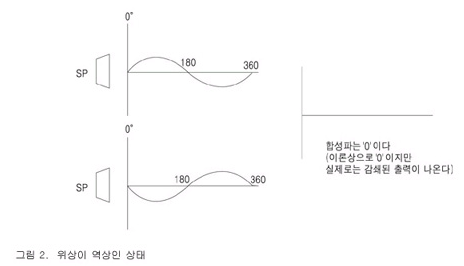 그러나 그림 2처럼 두 개의 스피커에서 나오는 파형이 서로 "역상"이 되어 버리면 그