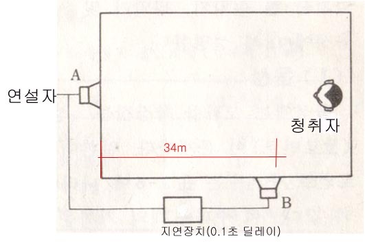그러나 B스피커에 지연장치를 주지않는다면 청취자는 방향성없이 B 스피커의 위치에 연설자가 서게된다.