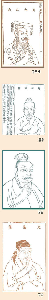 광무제 사후 황제의 자리를 이은 넷째 아들 명제(明帝) 유장(劉莊; 28~75)은 60년(永平 3년)에 28장을 추모하여 유명한 화가에게 명해 수도인 낙양에 위치한 남궁(南宮)의 운대(雲臺)에 초상화를 그리게 했다. 이후 이들을‘운대이십팔장’이라고 부르게 되었다. 사실 후한을 개창할 때 유수를 도와 공을 세운 공신들은 대단히 많아 열후(列侯)에 봉해진 사람만도 1백여 명에 달했다. 유수는 개국공신들에게 크게 상을 내렸으나, 높은 지위를 줄 경우 나중에 황권을 위협한다는 사실을 알고 실권이나 실직(實職)을 주지는 않았다. 그래서 공신들 대부분은 낙양에서 열후의 신분으로 정기적으로 조회에만 참석했고, 등우, 이통(李通), 가복 등 소수 공신들만이 정사에 참가하였다. 또 외척 왕망이 한을 멸망시킨 것을 거울삼아 외척들의 지위를 높이지 않고 정사에 간여하지 못하게 했다. 마원(馬援) 같이 공훈이 큰 사람도 외척의 신분이라 운대이십팔장에 들어갈 수 없었다. 이로 볼 때 운대이십팔장은 공신들 중에서 공훈이 크되 외척의 신분이 아닌 사람들로서 광무제를 보필했던 사람들이라 할 수 있다. 광무제는 비록 공신들을 통제하였지만 매번 법을 굽혀 관용을 베풀었으며 작은 과실은 용서해주었다. 먼 지역에서 진귀하고 맛있는 음식이 진상되면 반드시 먼저 열후들에게 두루 하사하였으며 태관(太官, 황제의 음식과 연회 등을 담당)들에게도 남김없이 주었다. 이들 28장에 얽힌 몇 가지 일화를 소개한다. 운대주수(雲臺主帥), 등우 등우(鄧禹;2~58)는 이십팔장의 첫 번째 공신으로 ‘운대주수(雲臺主帥)’라고 불린다. 등우가 처음 유수를 만났을 때, “유수님의 위덕(威德)이 사해에 전해지는데 제가 촌척(寸尺)의 도움을 드려서 공명을 죽백(竹帛)에 남기고자 할뿐입니다.”라고 진심으로 말하였고 이에 유수는 그를 참모로 삼았다. 유수가 악양(樂陽)을 탈취했을 때, 등우는 이렇게 간하였다. “바야흐로 지금은 온 천하가 혼란스러워 백성들은 명군을 생각하기를 갓난아이가 자애로운 어머니를 그리워하는 것과 같습니다. 예로부터 흥함의 조건은 덕이 얇은가 두터운가에 달려있지 세력이 큰 가 작은가에 달려 있는 것이 아닙니다.” 등우는 유수보다 여덟 살이나 어렸으나 훌륭한 군지휘관이었으며 특히 인물을 꿰뚫어 보는 힘이 탁월하여 유수로 하여금 수많은 인재를 얻게 했다. 즉각 실행하고 반드시 공을 이루는, 오한 오한(吳漢; ?~44)은 강한 성격을 지니고 있었다. 그래서 그와 정벌전쟁을 나갈 때면 광무제가 불안해서 항상 다리를 한쪽으로 기울여서 설 정도였다. 장수들은 싸움터에서 전세가 이롭지 못하면 대부분 놀라고 두려워해서 평상심을 잃는다. 그러나 오한은 태연히 병장기들을 정돈하고 병사와 관리들을 격동시켜 힘이 솟구치게 하였다. 한번은 광무제가 사람을 보내 대사마가 무엇을 하고 있는지 보고 오게 하였는데, 싸울 때 쓰는 공격 도구를 수리하고 있다는 말을 보고받고는 감탄하며 말하였다. “오공이 사람들의 뜻을 강하게 만들어, 그 위엄이 마치 한 적국처럼 무겁구나!” 매번 군사를 동원할 때마다 아침에 조서를 받으면 저녁에 바로 길을 떠났다. 항상 즉시 명을 실행할 준비를 하고 있어서, 따로 길 떠날 채비를 할 필요가 없었던 것이다. 그래서 직책을 맡으면 반드시 공을 이루고 임무를 끝마쳤다. 조정에 있을 때는 세밀하게 살피고 삼가고 진실한 것이 그의 자태와 용모에 나타났다. 한번은 오한이 출정할 때 아내가 뒤에서 전답을 산 일이 있었다. 오한이 전장에서 돌아와서는 아내를 꾸짖으며 말하였다. “군사가 밖에 있어서 관리할 사람이 부족한데 어째서 전답을 이렇게 많이 산단 말이오!” 그러고는 구입한 전답을 형제와 친척들에게 모두 나누어주었다. 거침없는 마무 마무(馬武; ?~61)는 술을 좋아하고 도량이 크며 말을 숨기지 않고 거침없이 하였다. 술에 취하여 황제 앞에서 동열에 있는 대신들의 잘못을 힐책하였고, 조금도 거리낌 없이 그들의 단점과 장점을 말하였다. 광무제는 짐짓 그를 용서하고 웃으면서 즐거워하였다. 유지자사경성(有志者事竟成), 경감 도전 8편 104장에 경감에 대한 말씀이 있다. 하루는 상제님께서 성도들에게 말씀하시기를 “속담(俗談)이 모두 성담(聖談)이요, 인생의 비결이니라.” 하시고 이르시기를 “유지자사경성(有志者事竟成)이라. 뜻있는 자는 한번 뜻을 세우면 평생을 한결같이 일관하여 필경에는 성취한다는 말이요 지성이면 감천이라고, 말로는 쉽지마는 어찌 쉽게 행하리오.” 하시니라. (道典 8:104) 광무제는 임치에 도착하여 친히 병사들을 위로하였는데, 많은 신하들이 모인 자리에서 경감을 일러 말하였다. “옛날에는 한신이 역하를 쳐부수어 기초를 닦았고, 지금은 장군이 축아를 공격해서 뜻을 이루었는데, 이곳은 모두 제(齊)의 서쪽 경계이니 그 공이 서로 비견할 만하다. 그런데 한신은 이미 항복한 자를 습격한 것이고, 장군은 홀로 강한 적을 탈취한 것이라 그 공은 한신이 세운 것보다 훨씬 어려운 것이다. 장군은 이전에 남양에서 큰 계책을 세웠으며 항상 뜻이 커서 세상 사람들이 이해하기 어려웠는데, 뜻이 있으면 일은 마