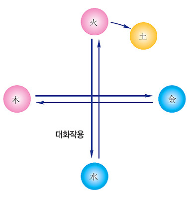 火는 정반대에 있는 水의 대화작용을 받습니다. 그래서 불의 겉은 밝은 양(火)이지만 속은 어둡습니다(水). 그리고 불이 다 타고나면 재(土)가 남듯이 火가 변화를 거친 최종적인 모습은 土임을 알 수 있습니다.