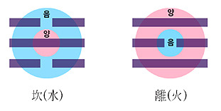 팔괘는 사물의 상을 양괘와 음괘로 표시한 것입니다. 물을 예로 들어보면 물(水)은 씨앗과 같은 상으로 음이 양을 싸고 있는 모습입니다. 그래서 감괘는 바깥은 음괘이고 안은 양괘로 구성되어 있습니다. 반면 불(火)은 분열하는 양을 음이 잡아당기고 있습니다. 그래서 리괘는 바깥이 양괘이고 안이 음괘로 구성되어 있습니다.