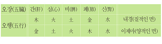 내경(內經)과 이제마의 개념 비교 동양의학의 시초인 황제내경(皇帝內經)에서는 질적인 면에서 바라본 오행 개념의 기초를 이루고 있습니다. 반면 이제마 선생은 양적인 면에서 오행의 개념을 이야기합니다. 이를 비교해 보면 다음과 같습니다.