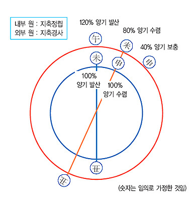 그러나 지축이 지금처럼 양방(陽方, 동북방)으로 기울어지면 午火는 자기역량 이상을 발휘하게 됩니다. 火는 남쪽에서 분산하는 힘이 더욱 크기 때문입니다. 이를 수치로 120%의 힘을 사용했다고 가정해 보겠습니다. 未土는 반대로 사정위(四正位)에서 쫓겨났으므로 자신의 역량을 모두 발휘할 수 없습니다.