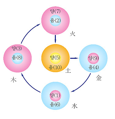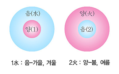 오행과 수(數) 그래서 水는 음이지만 이면의 성질은 양이기 때문에 양수(陽數)인 1을 붙여서 1水라고 하며, 火는 양이지만 이면의 성질은 음이므로 음수(陰數)인 2를 붙여서 2火라고 하는 것입니다. 결국 1水, 2火라고 함으로써 수화의 성질을 표현한 것임을 알 수 있습니다.