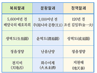 선천팔괘와 후천팔괘 흔히 복희팔괘를 선천팔괘라고 하고 문왕팔괘를 후천팔괘라고 합니다. 이때의 선천은 어머니 뱃속에서 자라면서 규정되어진 것을 말하며 후천은 태어나 자라면서 형성되어진 것을 말합니다. 그러나 태어난 이후를 놓고 보면 생장의 전반기는 선천, 성숙의 후반기는 후천에 해당합니다. 그러므로 이때는 문왕팔괘가 선천팔괘이며 정역팔괘는 후천팔괘에 해당합니다.