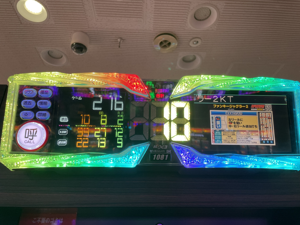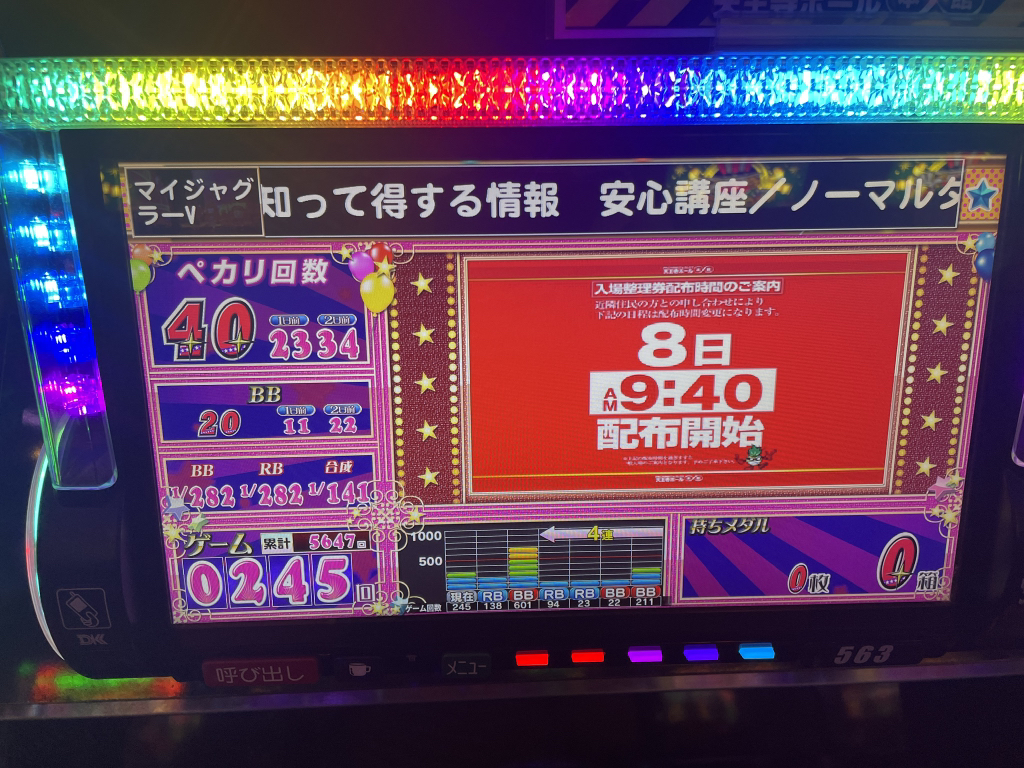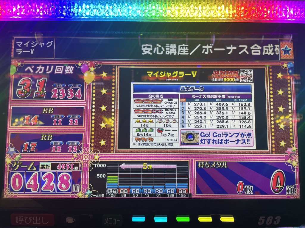 빅7/바케5 보고 퇴각합니다. 메달 300매 적립했는데 장기하마리에 바케로 응답하는 펑키자그라… 저설정인데 아주 잠시 고설정인척 하다가 다 빼먹습니다. 남은 300메달 아임이랑 고고자그라로 다 날렸습니다ㅠㅠ 옆집인 덴노지홀로 장소변경 합니다.