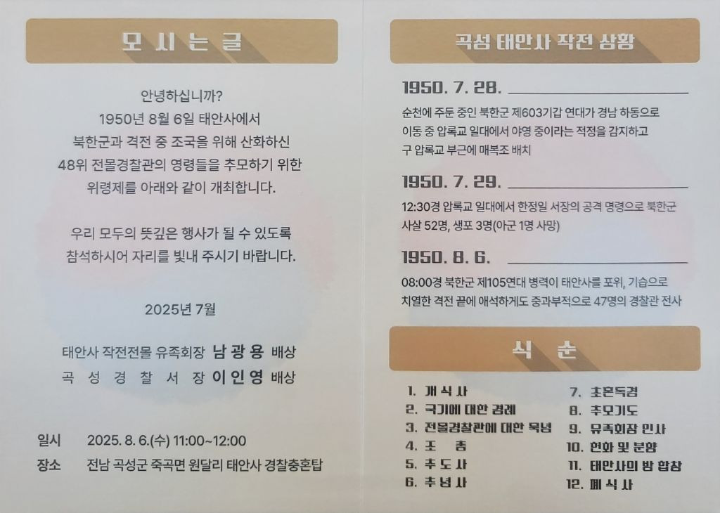 태안사 경찰 작전 전몰 추모 위령제 2025.8.6 작성자권능평강샛별엄마|작성시간25.08.07|조회수21 목록 댓글 0 글자크기 작게가 글자크기 크게가 다음검색 현재 게시글 추가 기능 열기 북마크 공유하기 신고 센터로 신고 댓글 댓글 0 댓글쓰기 댓글 리스트