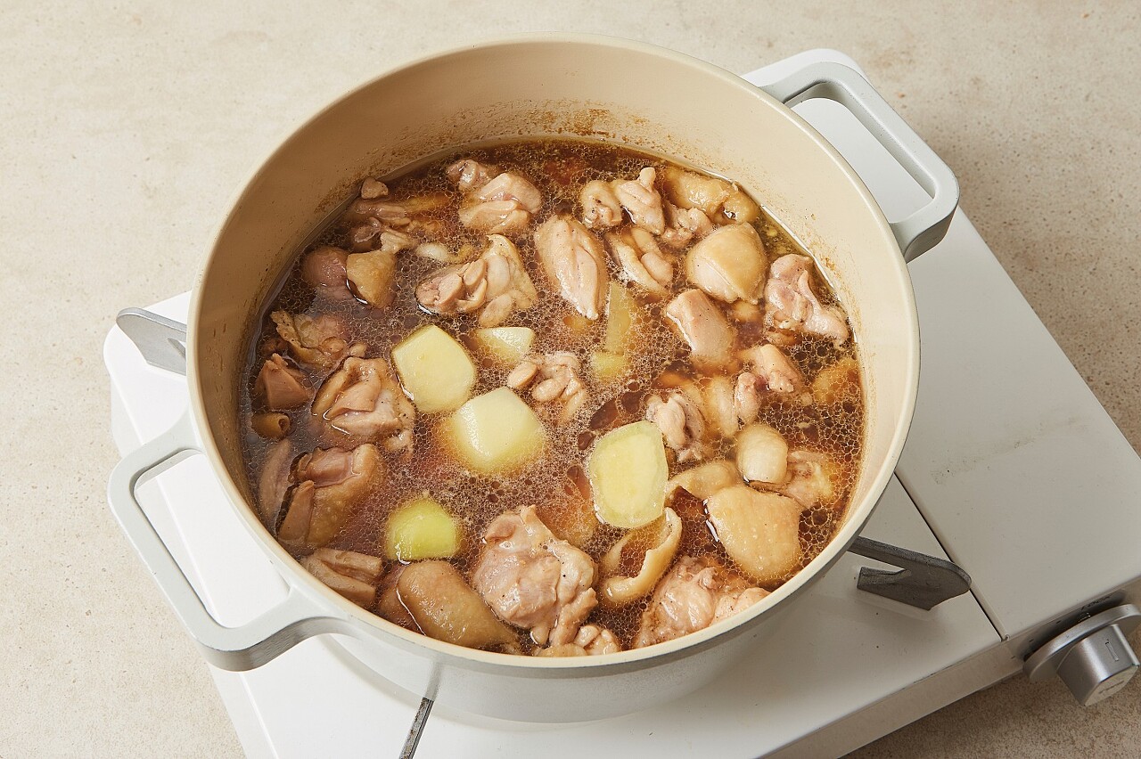 4. 끓어오르면 손질한 닭다릿살과