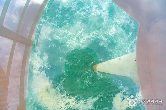 입장하기 전에는 강화유리가 더러워지지 않도록 덧신을 신고 입장해야 한다. 투명한 강화유리 아래로 파도가 넘실대는 모습을 보니 조금 무섭다는 생각이 든다.