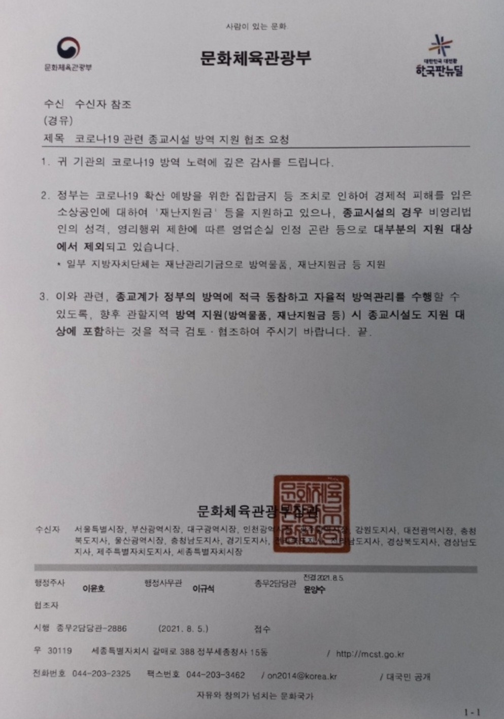미자립 교회와 종교시설이 코로나19 재난지원금 대상에서 제외되지 않도록 청원과 청책 건의를 지속적으로 추진하고 있다