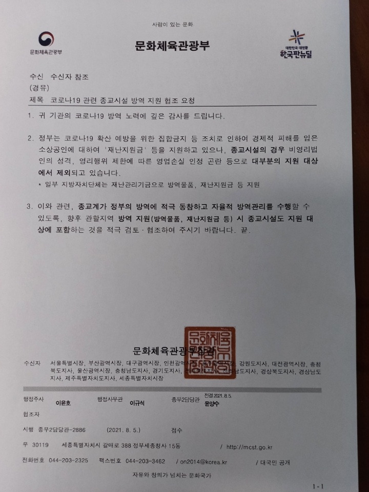 진지난 정부에서는 문화체육관광부에서 종교시설도 지원대상에 포함하는 것을 적극 검토 협조 공문을(2021, 8, 5일)19개 시도에 시달하였으나 잘 협조가 되지 못하였습니다,
