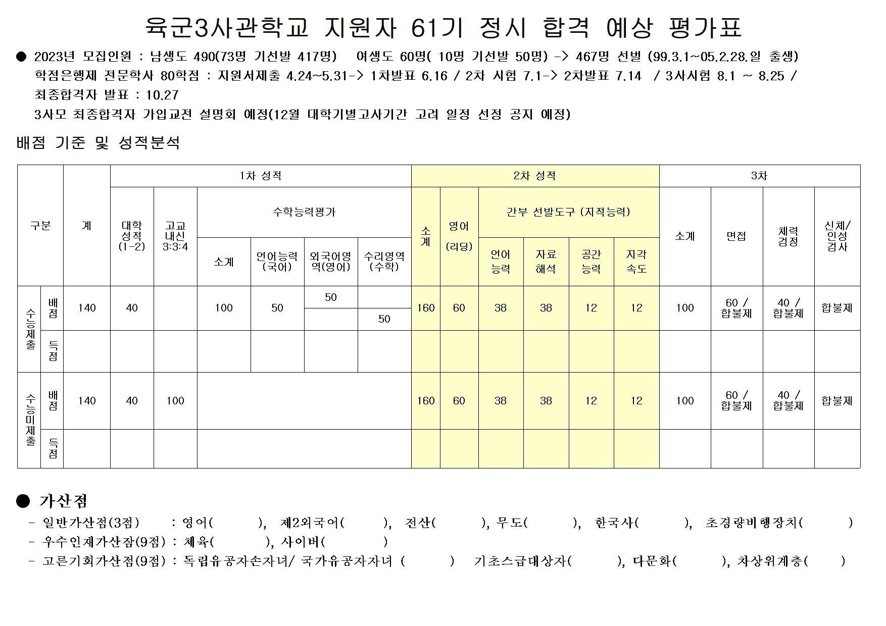 | #알립니다 : 61기 정시에 지원하려는 지원자들은 아래 육군3사관학교 지원자 합격예상 평가표를 참고 하여 자기 진단을 할 것 생도61기 정시지원자들을 위한 자기진단표입니다 1,2,3차 시험에 필요한 내용들을 기재해 보면 무엇이 부족한지를 알수 있고 각 시험일자 전까지 부족한 부분을 조금이라도 보충한다면 합격의 영광이 있을 것입니다 * 이미지 아래 첨부파일을 다운로드하여 출력후 사용 * 자기 진단 후 무엇이 부족한가를 판단하여 죽을 함을 다하여 해당 항목의 최고 점수를 획득할 수 있도록 계획을 수립한 후 입시 준비에 만전을 다할 것. * 합격율을 높이는 방법은 이미 성적을 향상할 수 없는 항목 (대학성적, 수능성적등)을 제외하고 점수를 높일 수 있는 가산점 획득을 위한 자격증 획득, 영어 및 간부선발도구 학습, 부모님과 함께 면접요령을 연습하고 체력검정 점수를 항목별 최고 점수를 획득 할 수 있도록 하는 것이 최선의 방법임 * 체력검정시 어느 항목이 배점이 높은가를 고려하여 체력을 안배하여야 하고 체력검정 평가표를 정확히 분석하여 체력검정 전략을 짜는데 신경을 써야 함. 국민체육진흥원의 체력검정은 수시로 하여 최고 점수를 제출할 것 *특히 면접과 체력검정은 실제로 연습하는 것이 중요하고 실제 면접 및 체력검정시에는 연습결과의 80 %정도만 결과에 나타날 수 있다는 것을 염두에 들것) |