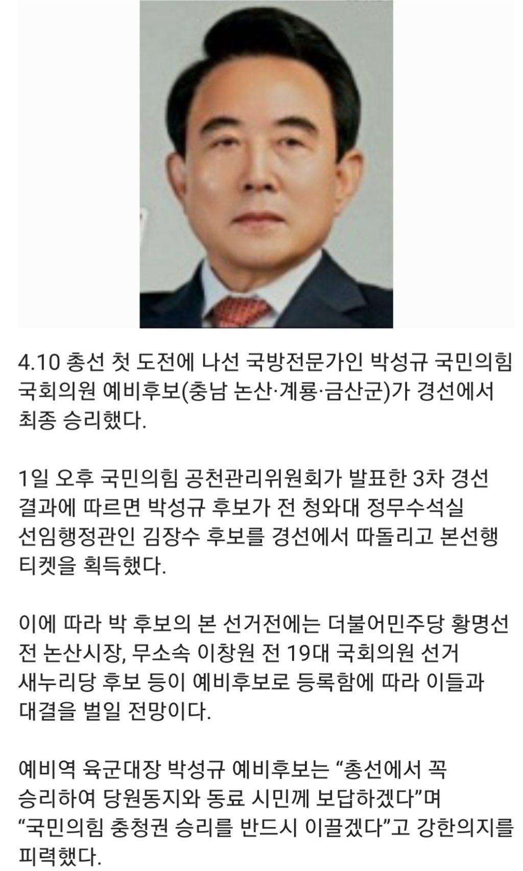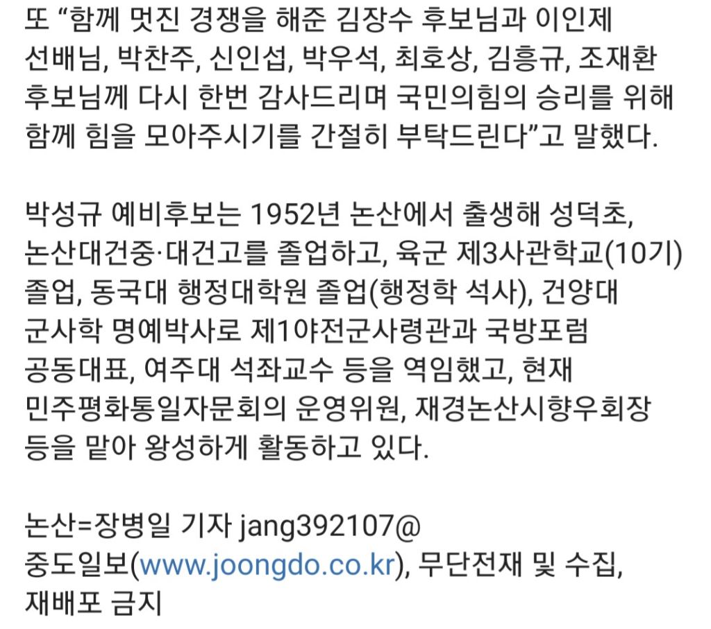 박성규(10기) 후보, 국민의힘 ‘논산·계룡·금산’ 공천확정 작성자木人17김인봉|작성시간24.03.02|조회수273 목록 댓글 3 글자크기 작게가 글자크기 크게가 다음검색 현재 게시글 추가 기능 열기 북마크 신고 센터로 신고 댓글 댓글 3 댓글쓰기 답글쓰기 댓글 리스트 작성자박권순20 | 작성시간 24.03.03 경선 승리를 축하드립니다. 총선 본선에서 곡 승리하시길 기원합니다. 작성자막걸리5(金南一) | 작성시간 24.03.02 확정 됐으니 적극 밀어줍시다 작성자멋쟁이3 차상춘 | 작성시간 24.03.03 꼭 당선되어 국회의원으로 소임을 다하시고지역구의 현안과 충성대를 빛내주시기 바랍니다 댓글 전체보기