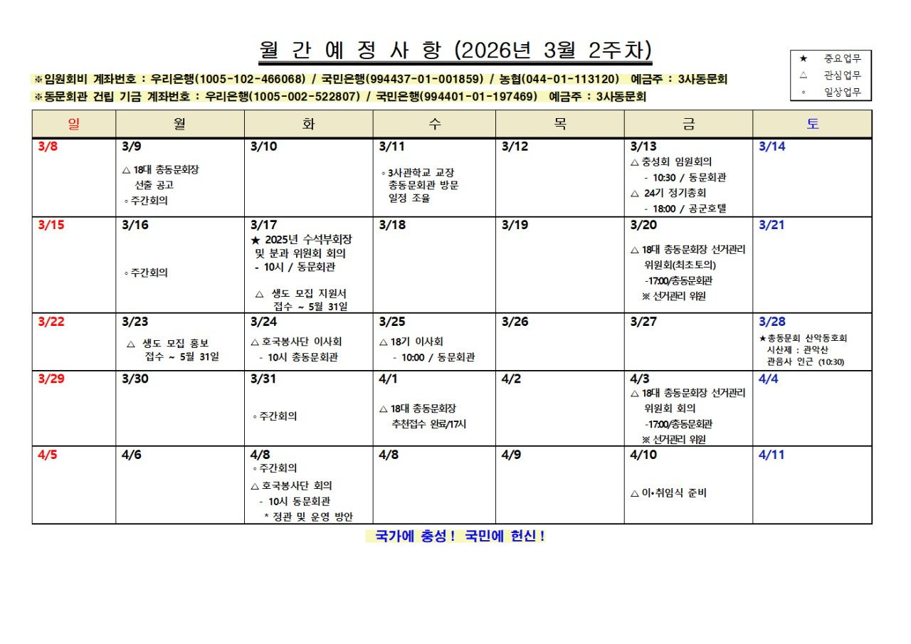| #총동문회공지 : 총동문회 2026년 3월 2주차 예정사항 (글 : 사무총장 24기 소상기) 존경하는 동문 선후배님, 안녕하십니까. 만물이 소생하는 새 봄을 맞아 동문님들의 가정에 건강과 행복이 가득하시길 기원합니다. 우리 총동문회는 지난 제44차 정기총회를 기점으로, 새로운 도약을 준비하는 중요한 시기를 맞이하고 있습니다. 특히 향후 우리 동문회를 이끌어갈 제18대 총동문회장 선출을 위한 공고와 함께, 3월과 4월에 예정된 주요 회무 일정을 아래와 같이 안내해 드립니다. 동문 여러분의 적극적인 관심과 성원을 부탁드립니다. [주요 회무 및 행사 일정] 1. 제18대 총동문회장 선출 관련 - 선출 공고: 3월 9일(월) - 선거관리위원회 토의: 3월 20일(금) 17:00 / 동문회관 - 추천 접수 마감: 3월 31일(화) 17:00 - 선거관리위원회 회의: 4월 2일(목) 17:00 / 동문회관 2. 각 기수 및 단체별 정기 모임 - 충성회 임원회의: 3월 13일(금) 10:30 / 동문회관 - 24기 정기총회: 3월 13일(금) 18:00 / 공군호텔 - 18기 이사회: 3월 25일(수) 10:00 / 동문회관 3. 위원회 및 부설기관 일정 - 수석부회장 및 분과위원회 회의: 3월 17일(화) 10:00 / 동문회관 - 호국봉사단 이사회: 3월 24일(화) 10:00 / 동문회관 - 호국봉사단 운영회의: 4월 8일(수) 10:00 (정관 및 운영방안 논의) 4. 동호회 및 기타 행사 - 총동문회 산악회 시산제: 3월 28일(토) 10:30 / 관악산 관음사 인근 - 3사 생도 모집 홍보 및 접수: ~ 5월 31일까지 (주변 인재 추천 바랍니다) 현재 사무총장실에서는 제18대 회장단 이·취임식 준비를 포함하여 동문회의 품격을 높이기 위한 제반 업무에 만전을 기하고 있습니다. 군인의 절개와 선비의 기품이 함께하는 우리 총동문회가 더욱 화합하고 발전할 수 있도록 힘을 모아주시기 바랍니다. 감사합니다. 육군3사관학교 총동문회 사무총장 소상기 올림 |
