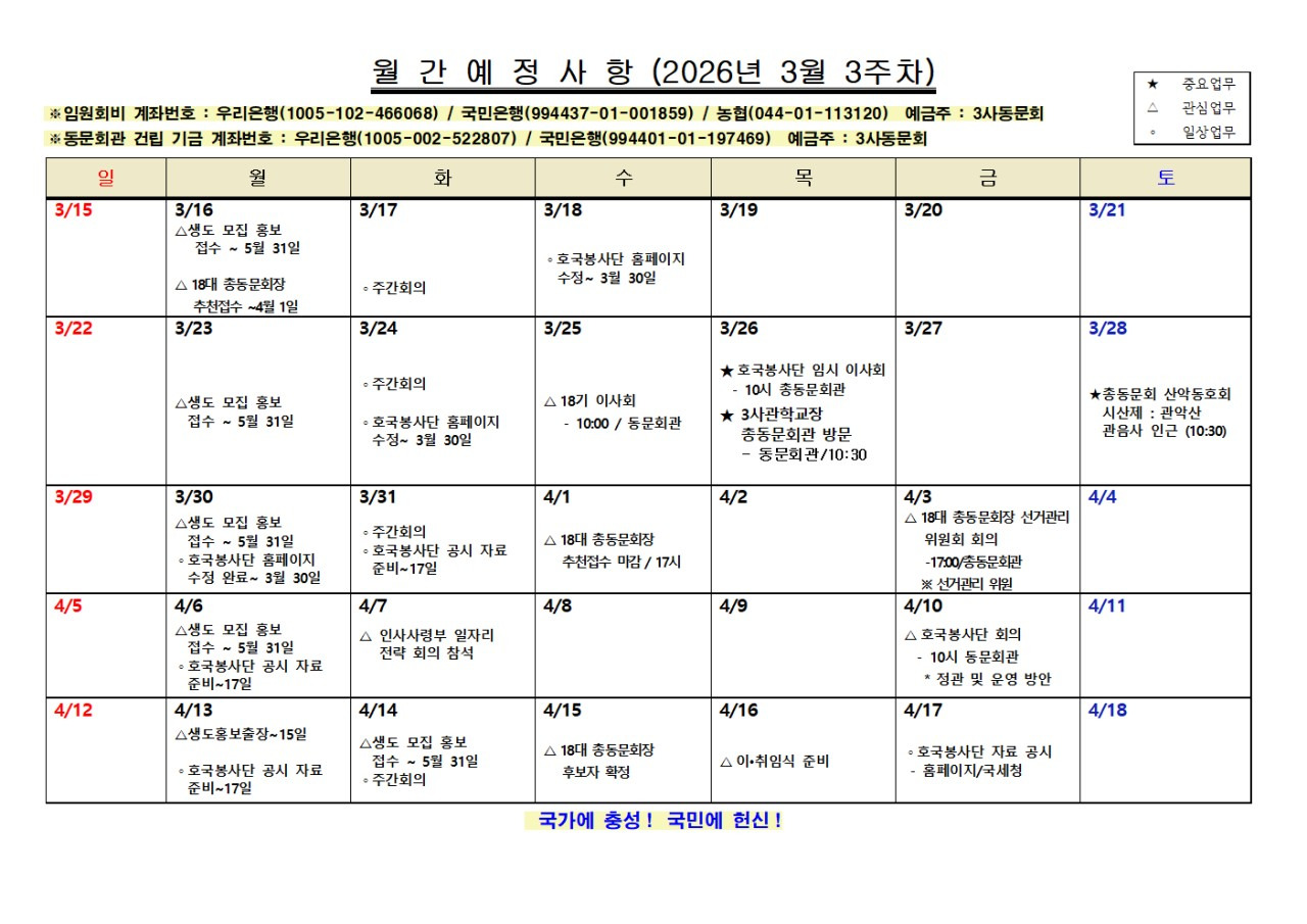 | #총동문회공지 : 총동문회 2026년 3월 3주차 예정사항 (글 : 사무총창24기 소상기) 존경하는 선·후배 동문 여러분, 안녕하십니까. 총동문회 사무총장입니다. 만물이 소생하는 봄기운과 함께 동문님들의 가정에 늘 건승과 행복이 가득하시길 기원합니다. 3월 셋째 주 주요 사항을 다음과 같이 안내드리오니 일정에 참고해 주시기 바랍니다. 1. 동문회 주요 당면 과제 - 제18대 총동문회장 추천 접수: 오는 4월 1일(수)까지 후보자 추천을 받고 있습니다. 동문회의 미래를 이끌어갈 훌륭하신 분들이 추천될 수 있도록 많은 관심 부탁드립니다. - 생도 모집 홍보 활동: 미래 정예 장교 양성을 위한 생도 모집 홍보 접수가 5월 31일까지 계속됩니다. 주변의 우수한 인재들이 지원할 수 있도록 적극적인 격려와 홍보를 당부드립니다. 2. 주요 행사 일정 - 3/16일(월) ~ 30일(월) : 호국봉사단 홈페이지 수정 및 정관 및 운영방안 보완 - 3/24(화) : 18기 이사회 (10:00, 동문회관) - 3/26(목) : 호국봉사단 임시 이사회 (10:00, 동문회관) - 3/26(목) : 3사관학교장 모교 방문 (10:30, 동문회관) - 3/28(토) : 총동문회 산악동호회 시산제 (10:30, 관악산 관음사 인근) - 4/13(월)~15(수) : 생도 홍보 출장 우리 총동문회와 호국봉사단은 동문 선·후배님들의 권익 신장과 사회 공헌을 위해 이번 주도 최선을 다해 정진하겠습니다. 환절기 건강 유의하십시오. 감사합니다. |