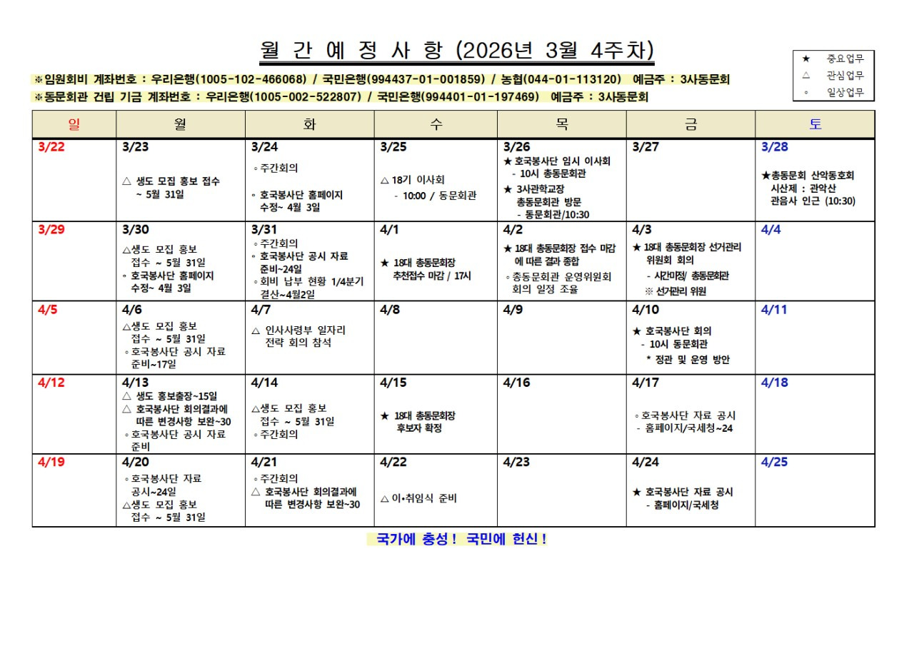 | #총동문회공지 : 총동문회 2026년 3월 4주차 예정사항 충성! 동문 선후배님, 안녕하십니까. 총동문회 사무총장입니다. 만물이 소생하는 새봄을 맞아 동문 여러분의 가정에 늘 건승과 행복이 가득하시길 기원합니다. 우리 총동문회 사무처에서는 동문회의 명예를 높이고 더욱 투명한 운영을 위해 매진하고 있습니다. 향후 4월 말까지 예정된 주요 업무 및 행정 사항을 아래와 같이 공유하오니 일정에 참고해 주시기 바랍니다. 1. 주요 회의 및 공식 행사 - 3월 26일(목) 10:00 : 호국봉사단 임시 이사회 (총동문회관) - 3월 26일(목) 10:30 : 모교 학교장 총동문회관 방문 접견 - 3월 28일(토) 10:30 : 총동문회 산악동호회 시산제 (관악산 관음사 인근) - 4월 10일(금) 10:00 : 호국봉사단 회의 (정관 및 운영 방안 논의) 2. 제18대 총동문회장 선출 관련 - 4월 1일(수) 17:00 : 후보자 추천 접수 마감 - 4월 3일(금) 시간미정 : 선거관리위원회 회의 (총동문회관) - 4월 15일(수화) : 제18대 총동문회장 후보자 확정 발표 3. 행정 및 홍보 추진 사항 - 생도 모집 홍보: ~ 5월 31일(일)까지 집중 홍보 및 접수 진행 - 호국봉사단 투명 경영: 홈페이지 수정 및 국세청 공시 자료 준비 - 호국봉사단 회의결과에 따른 변경사항 보완~30 - 총동문회 계 및 운영: 1/4분기 회비 납부 결산 - 동문회관 운영위원회 회의 일정 조율 4. 대외 협력 및 기타 - 7일(화) : 인사사령부 일자리 전략 회의 참석 - 4월 22일(수) 이후 : 차기 회장단 이·취임식 준비 착수 동문 여러분의 적극적인 관심과 참여가 우리 총동문회를 더욱 강하게 만듭니다. 사무처에서는 계획된 일정들이 차질 없이 진행될 수 있도록 최선을 다하겠습니다. 감사합니다. |