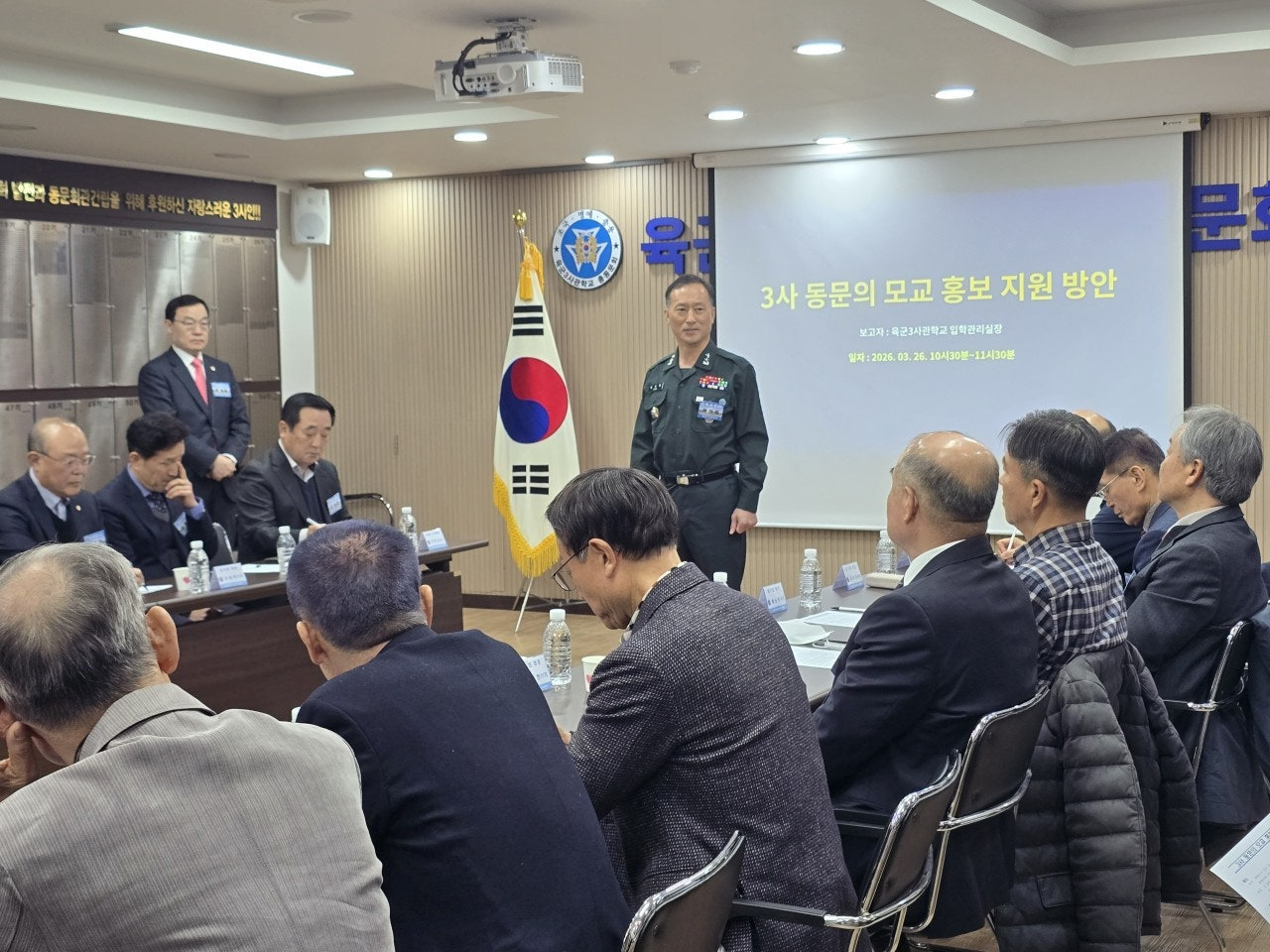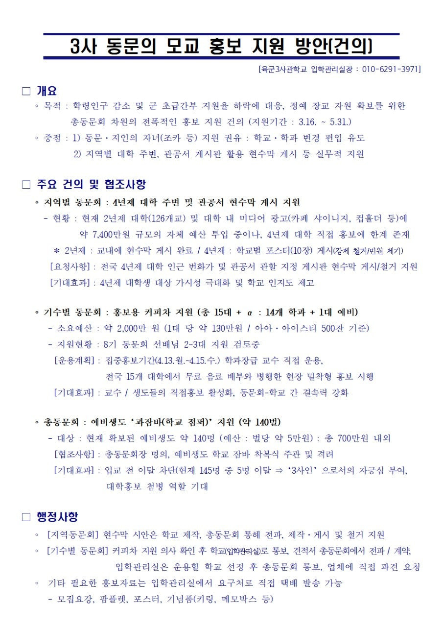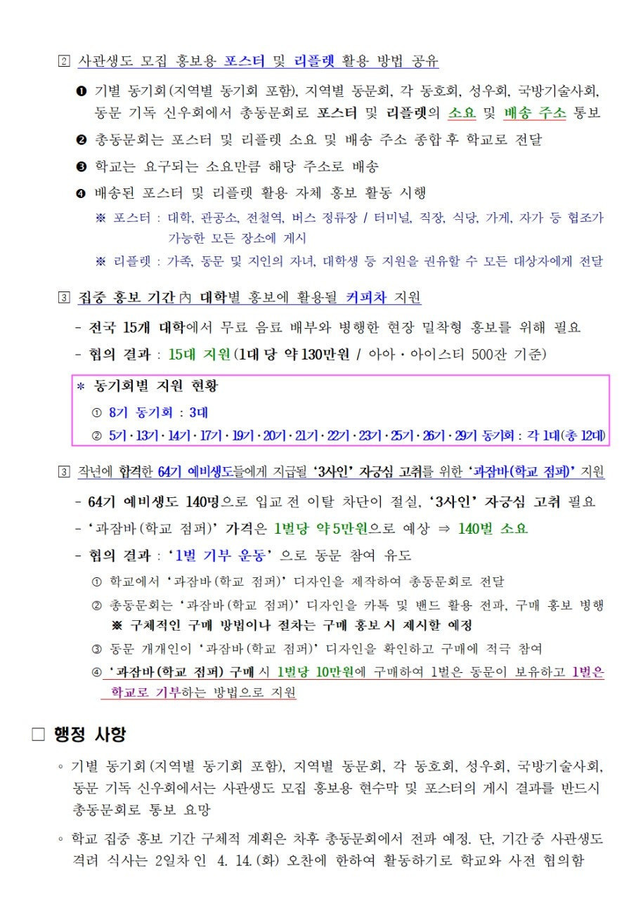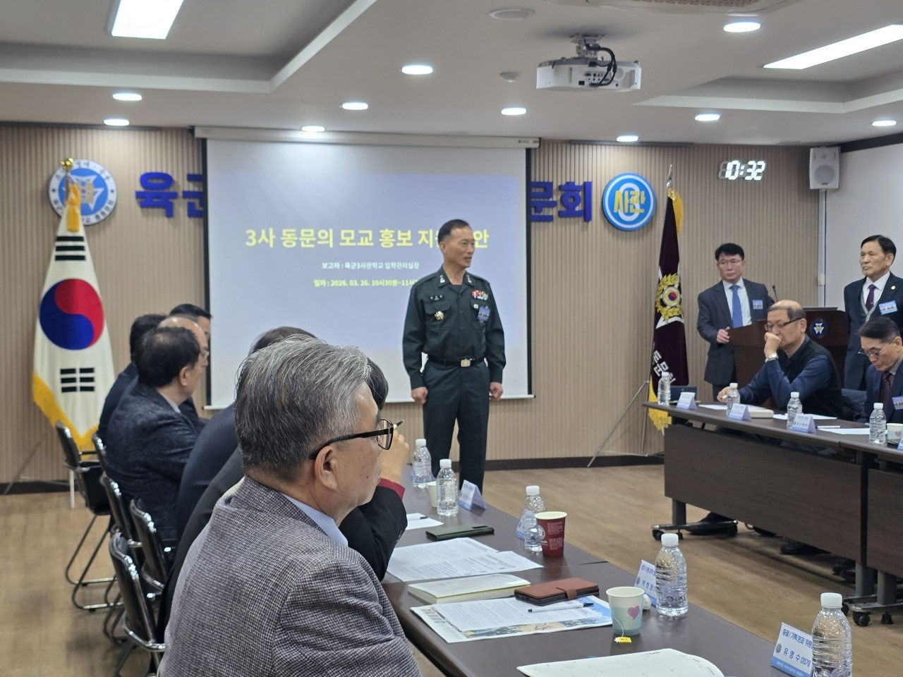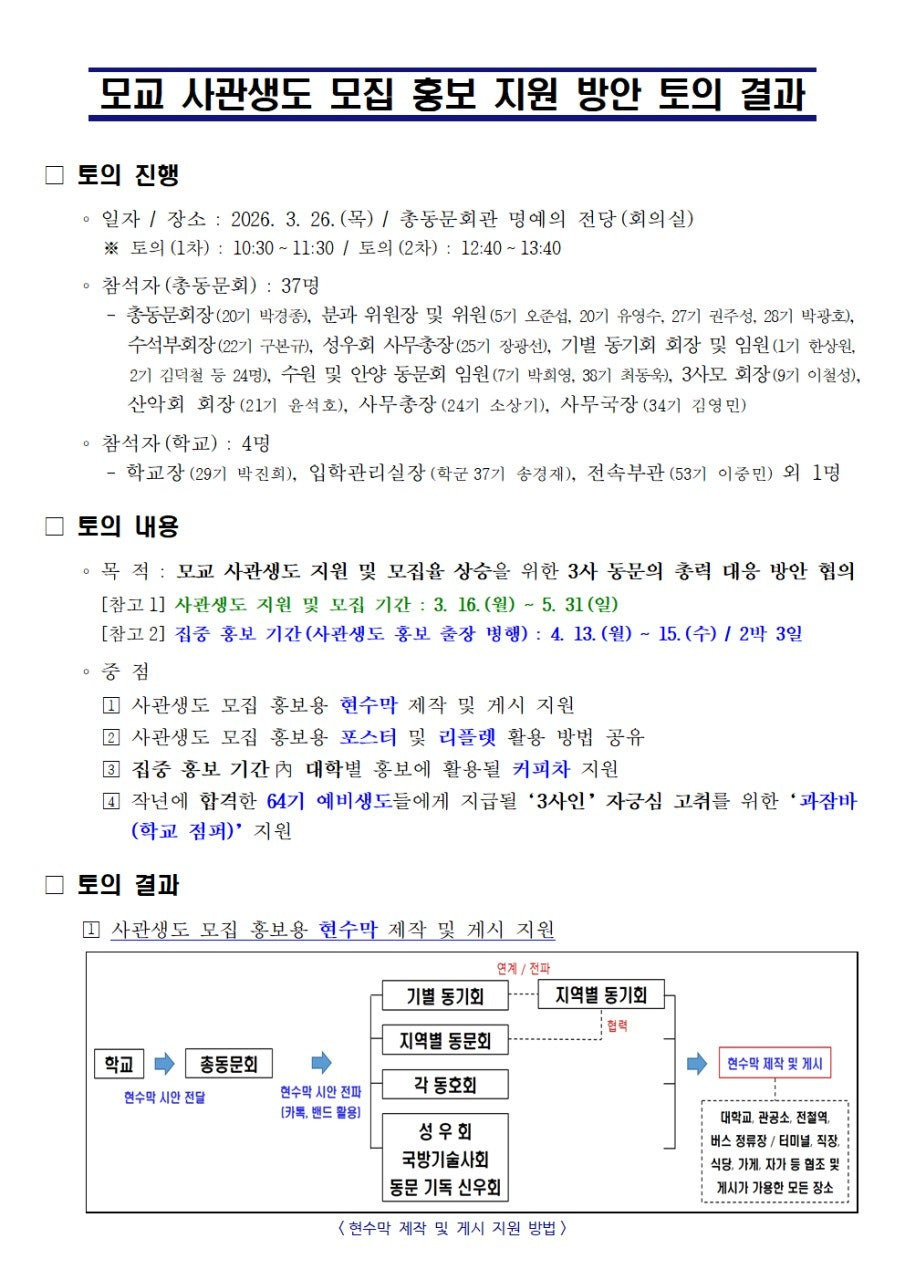 | ★ 모교 사관생도 모집 홍보 지원 방안 토의 결과 ★ (글 : 사무국장 34기 김영민) 안녕하셨습니까? 총동문회 사무국장입니다. 오늘, 영천에서 학교장 [소장 박진희(29기)] 께서 총동문회를 방문하셨습니다. 그리고, 37명의 많은 동문들께서 함께 자리를 하셔서 2026년도 '모교 사관생도 모집 홍보 지원 방안' 에 대해 실질적이고 심도있는 토의를 하였습니다. 그 결과를 모든 동문들께 아래와 같이 공유합니다. 부디 꼼꼬하게 읽어 보시고 한 마음 한 뜻으로 5만 동문의 힘을 적극 모아 주셔서 올 한해 성공적인 '사관생도 모집' 이 될 수 있도록 모든 동문들께서 애정깊은 관심과 함께 아낌없이 지원해 주시를 간절히 부탁드립니다. 아직까지는 아침, 저녁으로 날씨가 다소 쌀쌀합니다. 항상 건강에 유의하시고 항상 행복하십시오. 충성!!! [참고] 학교에서 배포한 토의 자료 게시판 선택 |