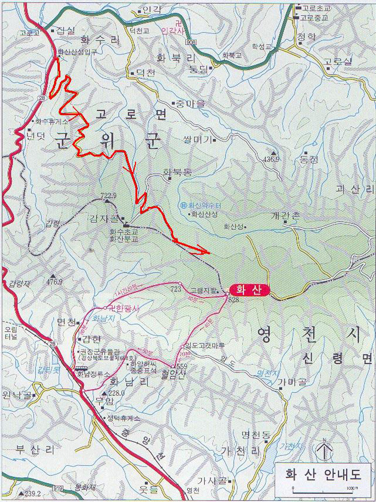 경상북도 군위군과 영천군에 걸친 화산(828m)dms 본래 화전민들이 거주하는 마을이였지만