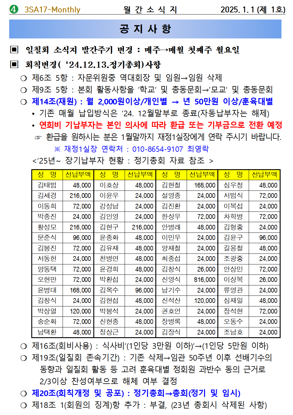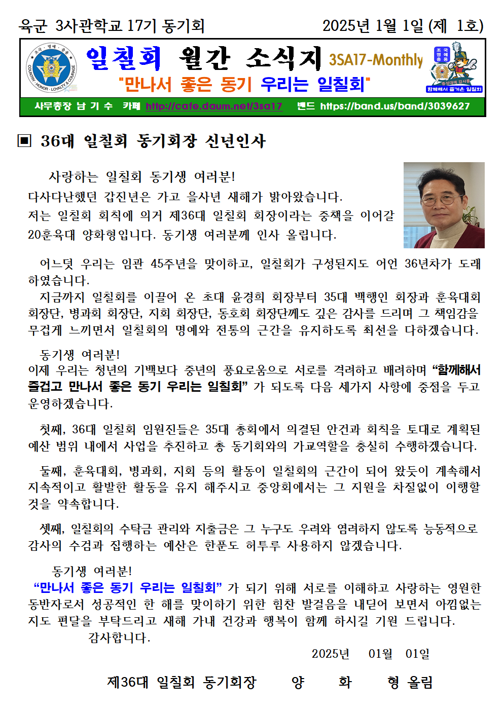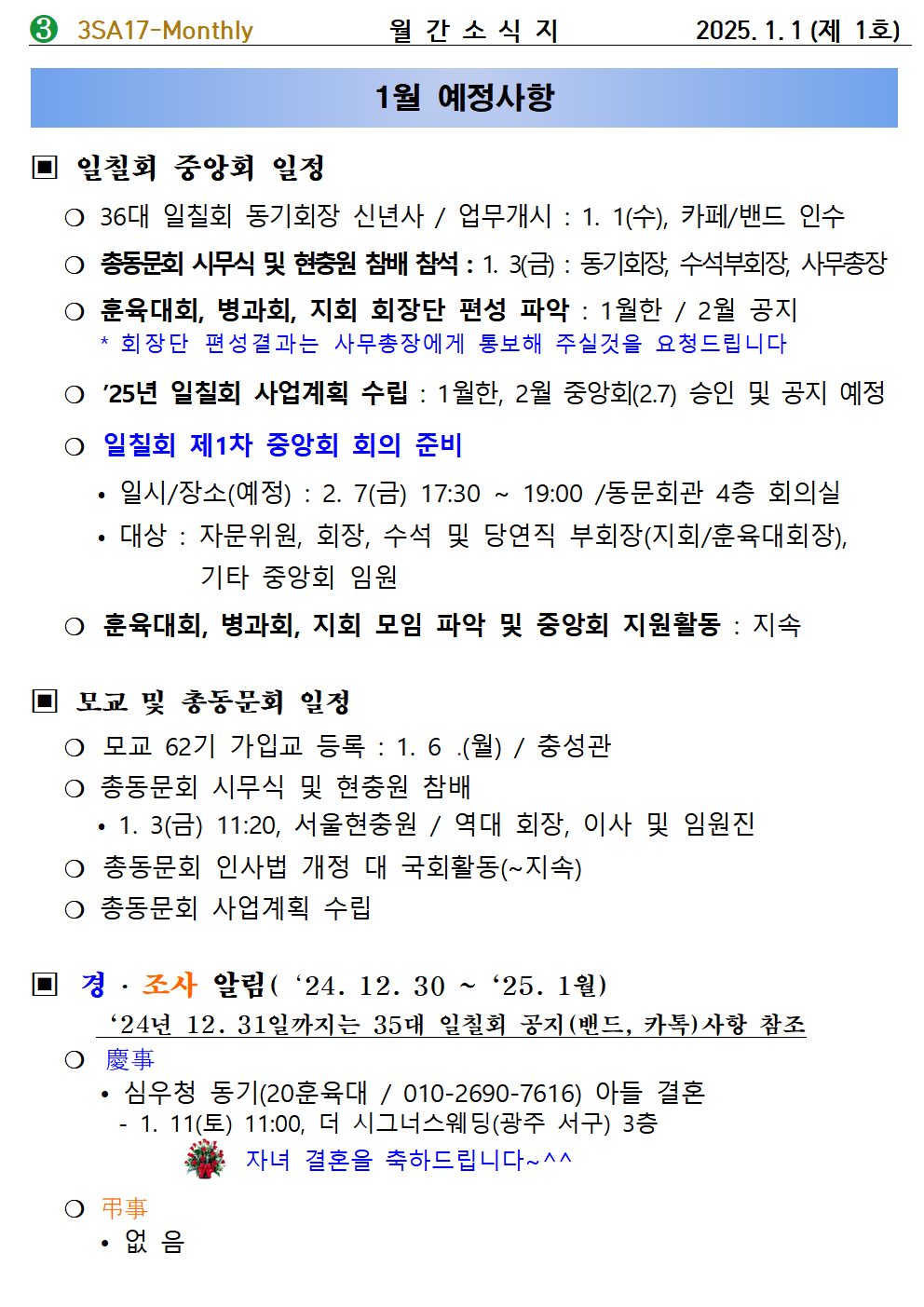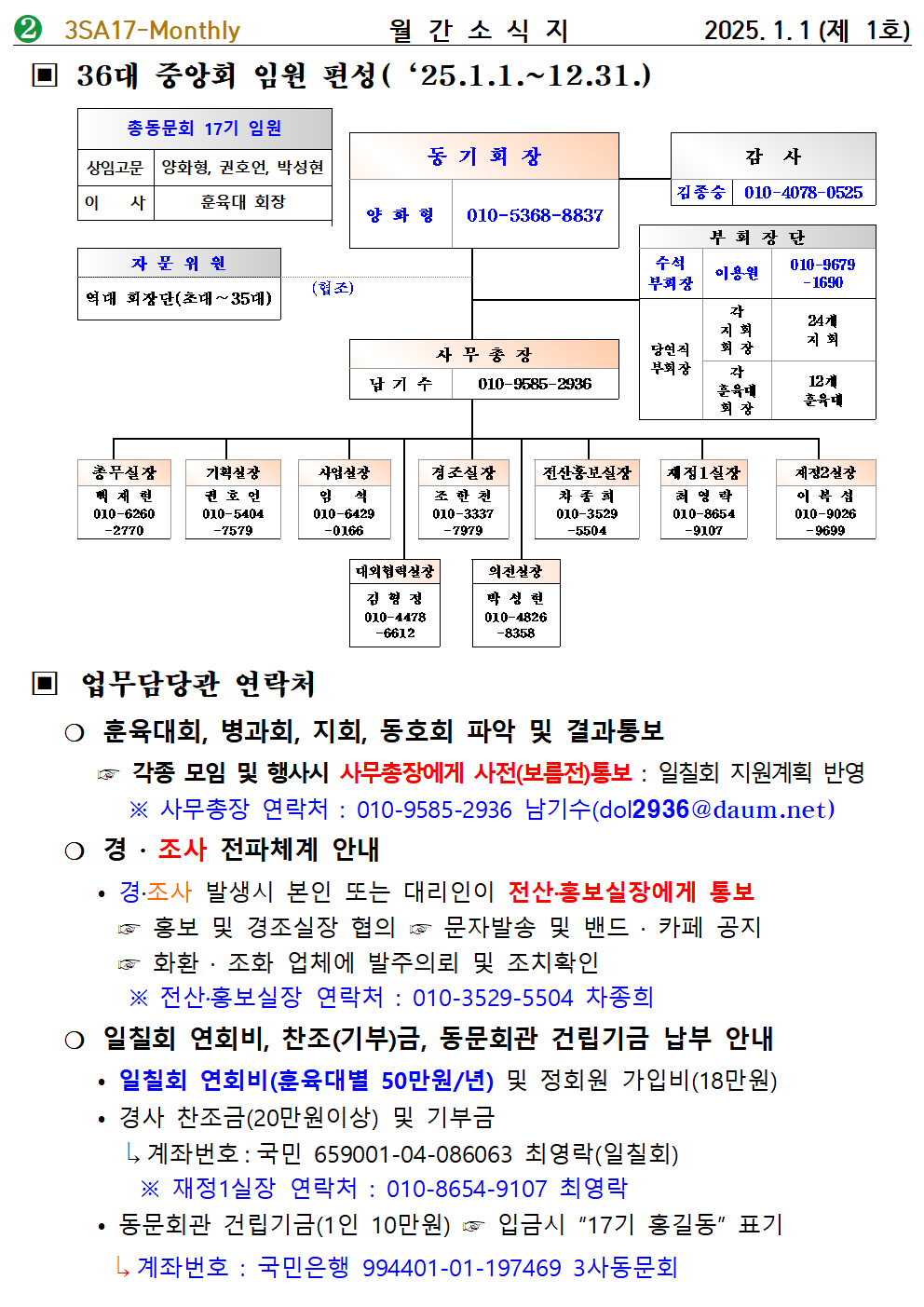 오늘은 36대 출범 첫날로 동기회장 신년인사, 조직도, 동기활동/경조사 담당자, 1월 예정사항, 공지사항 등을 올렸습니다.