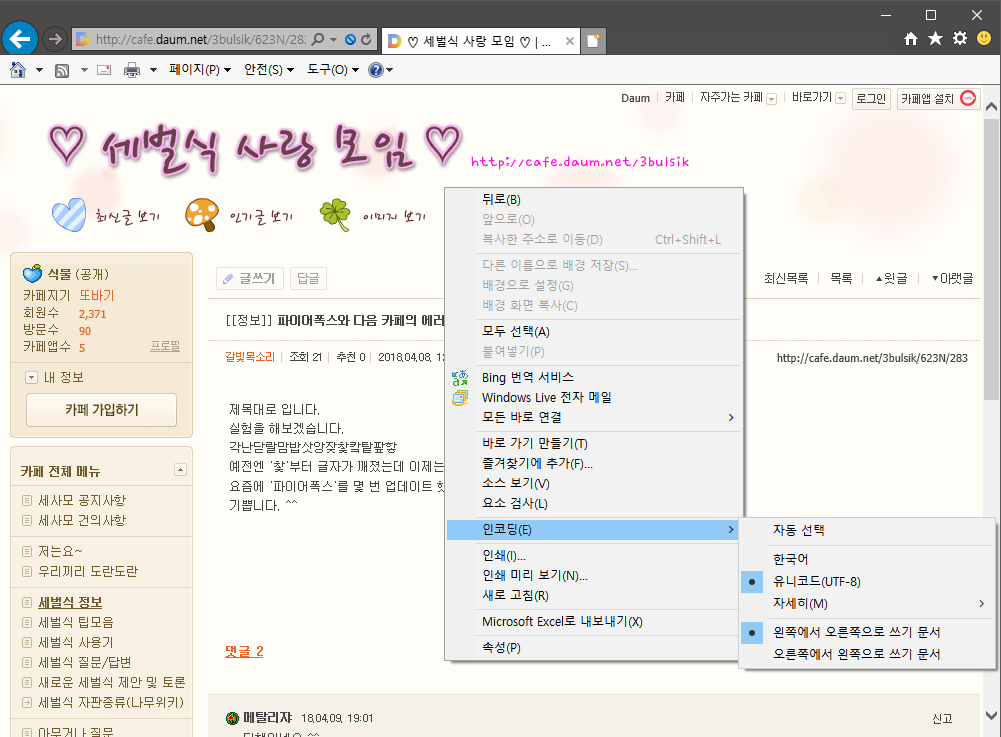 모르는 사이에 다음 카페 한글 인코딩 방식이 UTF-8로 바뀌었습니다.