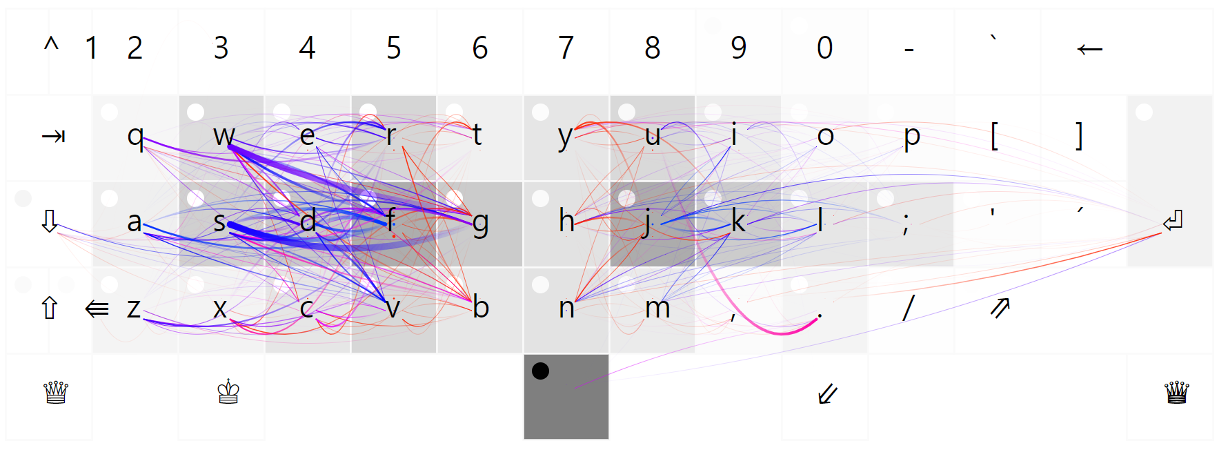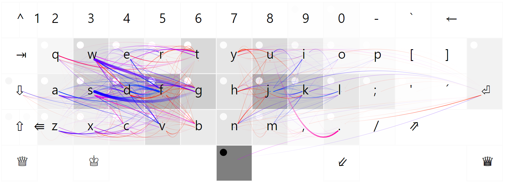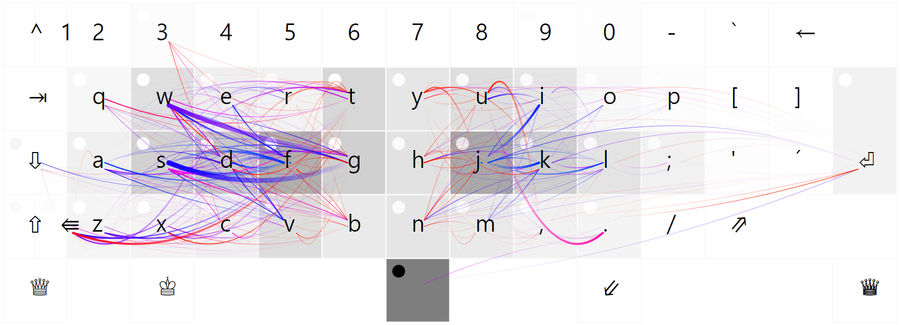- 다른 글쇠에서 오는 흐름과 다른 글쇠로 가는 흐름의 선이 모두 표시되어 있습니다. 선의 모양(곡률 등)과 색깔이 흐릿해지는 부분으로 구별할 수 있습니다. 선의 색깔이 흐린 쪽이 먼저 누른 부분, 짙은 쪽이 나중에 누른 부분입니다.