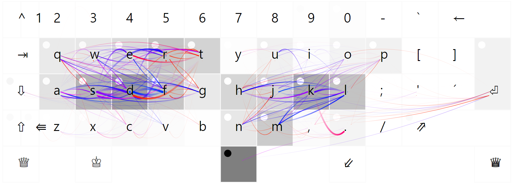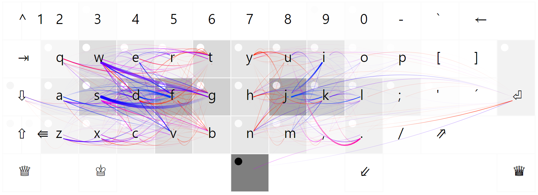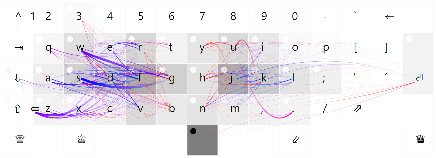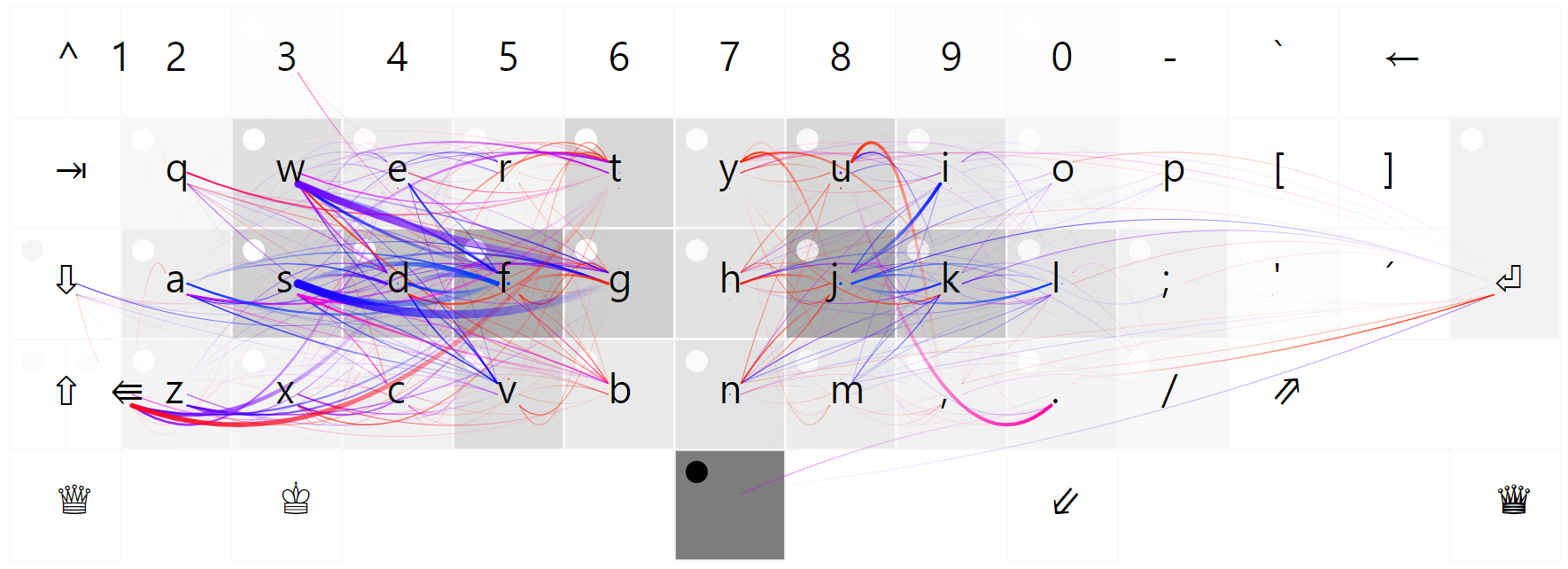 - 다른 글쇠에서 오는 흐름과 다른 글쇠로 가는 흐름의 선이 모두 표시되어 있습니다. 선의 모양(곡률 등)과 색깔이 흐릿해지는 부분으로 구별할 수 있습니다. 선의 색깔이 흐린 쪽이 먼저 누른 부분, 짙은 쪽이 나중에 누른 부분입니다.