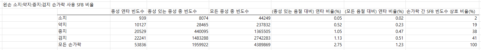 왼손의 경우 중성과 종성을 같은 키 영역에 배치해야 해서 SFB 비율을 줄이거나 없애기 위해 굉장히 정교한 설계가 필요합니다. 하지만 단 하나의 키만 종성용으로 더 배치해도 SFB 비율을 크게 줄일 수 있음을 발견했습니다. 바로 종성 ㅆ을 전통적 capslock 위치에 배치하는 것입니다. 종성 ㅆ는 종성 ㄴ,ㄹ,ㅇ,ㄱ만큼 그렇게 많이 사용되는 종성도 아니고 그렇다고 종성 ㅈ,ㅍ,ㅊ,ㅋ 등만큼 너무 적게 사용되는 종성도 아니면서 여러 모음과 굉장히 많이 조합되는 종성입니다. 그런 빈도수나 중성과의 조합성을 고려했을때 종성 ㅁ,ㅂ와 같이 분류될 수 있는데, 신세벌식 키보드 레이아웃 설계를 할때 종성 ㄴ,ㄹ,ㅇ,ㄱ를 제일 좋은 자리에 놓고 종성 ㅁ,ㅂ까지 배치한 이후 종성 ㅆ를 어디에 배치할까를 고민하게 될때 SFB를 줄이면서 자리 배치하기가 굉장히 까다로운 종성이라는 걸 느낍니다. 따라서 이 종성 ㅆ를 3*5=15의 전통적인 알파벳 배치 영역 밖으로 놓는 것이 SFB를 줄일 수 있는 방안이라는 결론에 이르릅니다. 이런 생각을 바탕으로 종성 ㅆ를 바깥으로 빼는 레이아웃 설계를 하였는데 왼손 SFB 비율이 모든 음절 대비 1.23%가 나옵니다. 굉장히 양호한 편이죠.