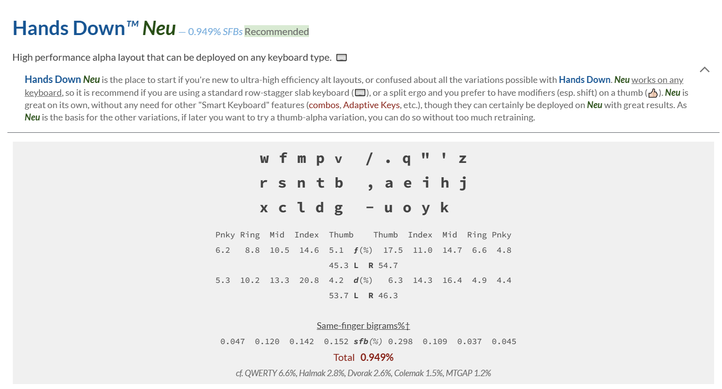 (Hands Down Neu) : 알파벳 배치가 소지 바깥쪽 행 자리를 침범하는 레이아웃