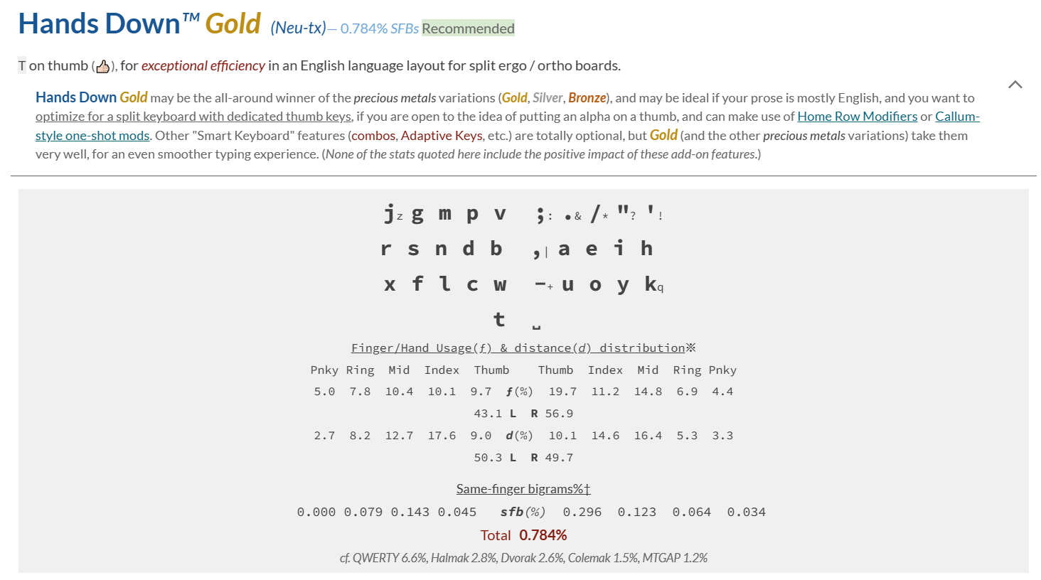 (Hands Down Gold) : 알파벳 배치가 엄지 키 자리를 침범하는 레이아웃