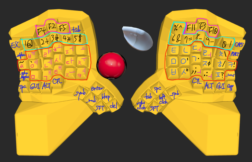 개인적으로 엄지 키는 레이어 전환이나 shift 등으로 사용해야 하는 기능 수행을 위한 영역이라고 판단하여서 알파벳 타건용으로 영역을 배정할 수 없었습니다. 숫자열은 레이어 전환 키나 shift를 누르지 않고 그대로 숫자 입력하는 데에 사용하고 싶었습니다. 따라서 세벌식 한글 입력을 위해 소지 바깥쪽 행을 침범하는 선택을 하였습니다.