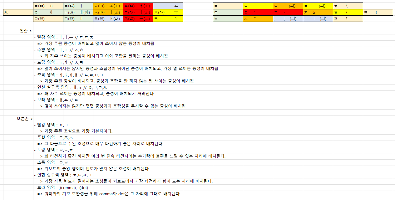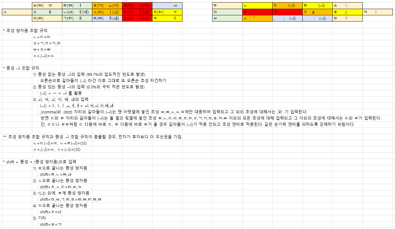 1) 쿼티 기준 t와 b 자리에 있었던 ㅕ와 ㅛ의 위치를 서로 맞바꾸었습니다. 중성 ㅕ와 종성 ㄱ 간의 연계를 더 편하게 하기 위해서입니다.