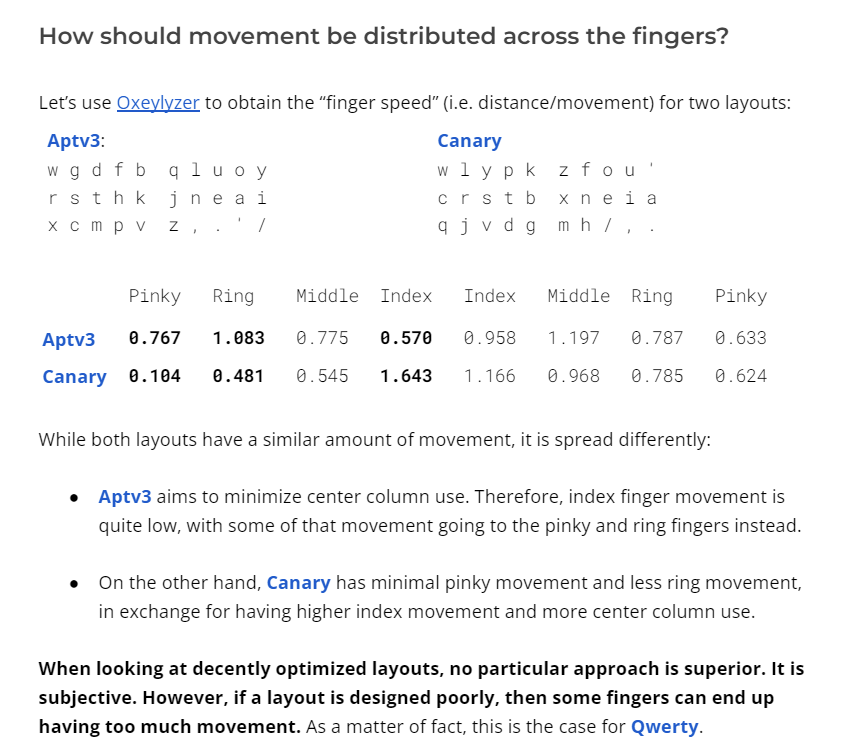 인용해주신 Keyboard layout docs의 "How should movement be distributed across the fingers?"에 보면 ( https://docs.google.com/document/d/1_a5Nzbkwyk1o0bvTctZrtgsee9jSP-6I0q3A0_9Mzm0/edit?pli=1#heading=h.28igl467oc81 ) Aptv3 레이아웃과 Canary 레이아웃의 두 철학이 서로 다름을 알 수 있습니다. (이 2개의 키보드 레이아웃은 현재 alt keyboard layout 커뮤니티에서 가장 각광받고 있는 레이아웃 목록에 들어갑니다.)