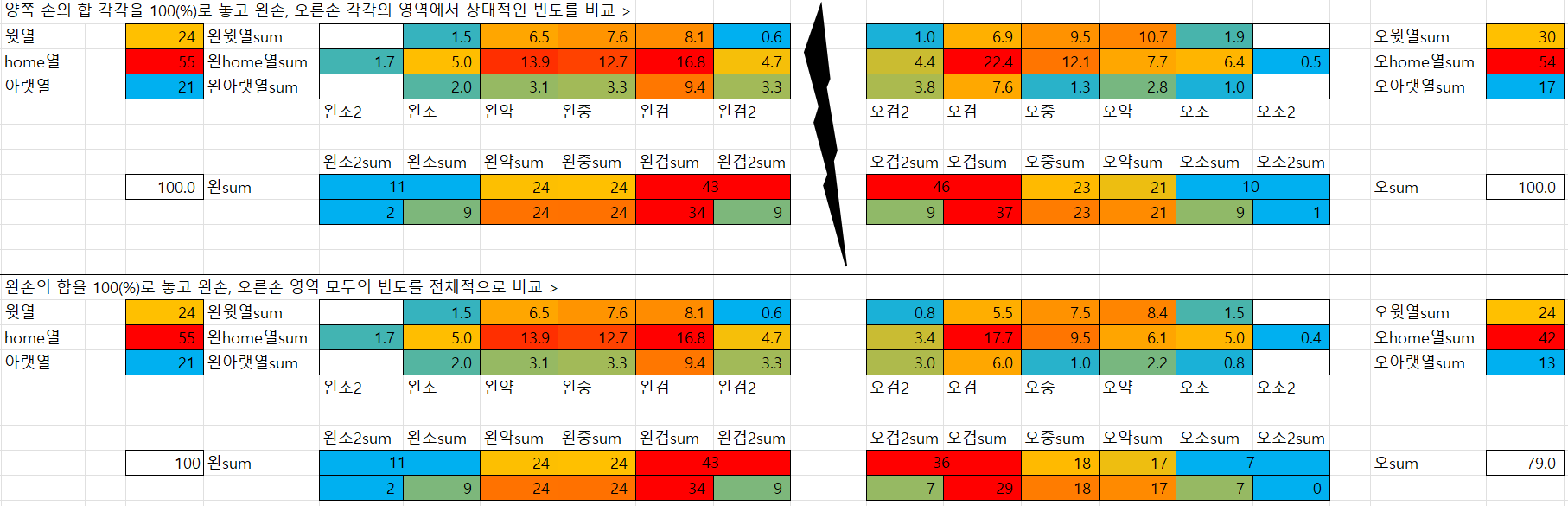 아래는 위에서 설계한 제 레이아웃의 히트맵과 왼손 SFB 비율입니다.