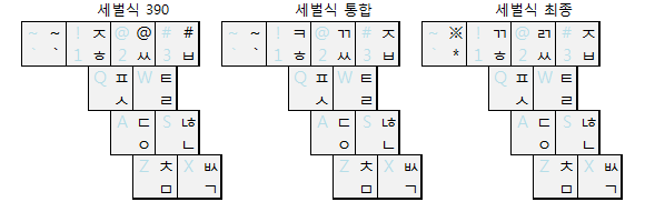 최종의 강점인 한글 기계화와 390의 강점인 쿼티 호환성에 대한 세벌식 통합의 성능을 알아보기 위해 글쇠의 분포를 비교해 본다.
