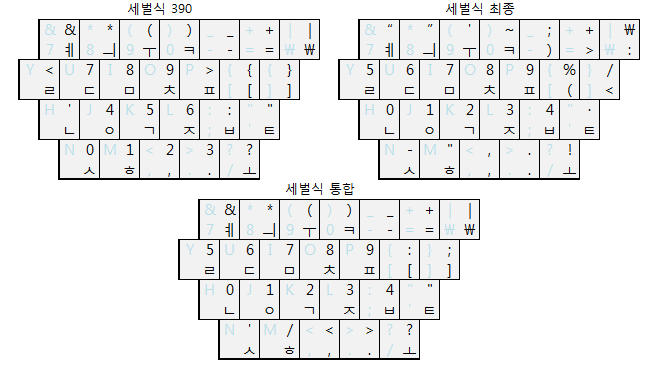 즉 세벌식 최종처럼 한글 자모의 기계적 입력을 최대한 지원하고, 한글 외의 기호 입력은 세벌식 390처럼 쿼티 자판의 틀을 따름으로써, 세벌식 한글 입력의 기능을 살리면서 영문 자판과의 호환성을 높이는 것이다.
