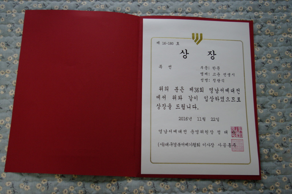제36회 대한민국 영남서예 대전 (한문부문)에서 특선을 수상한 무봉 정광식작가는, 실력을 인정받아 수상경력도 다양해졌다. 우리 모두가 축하합시다.